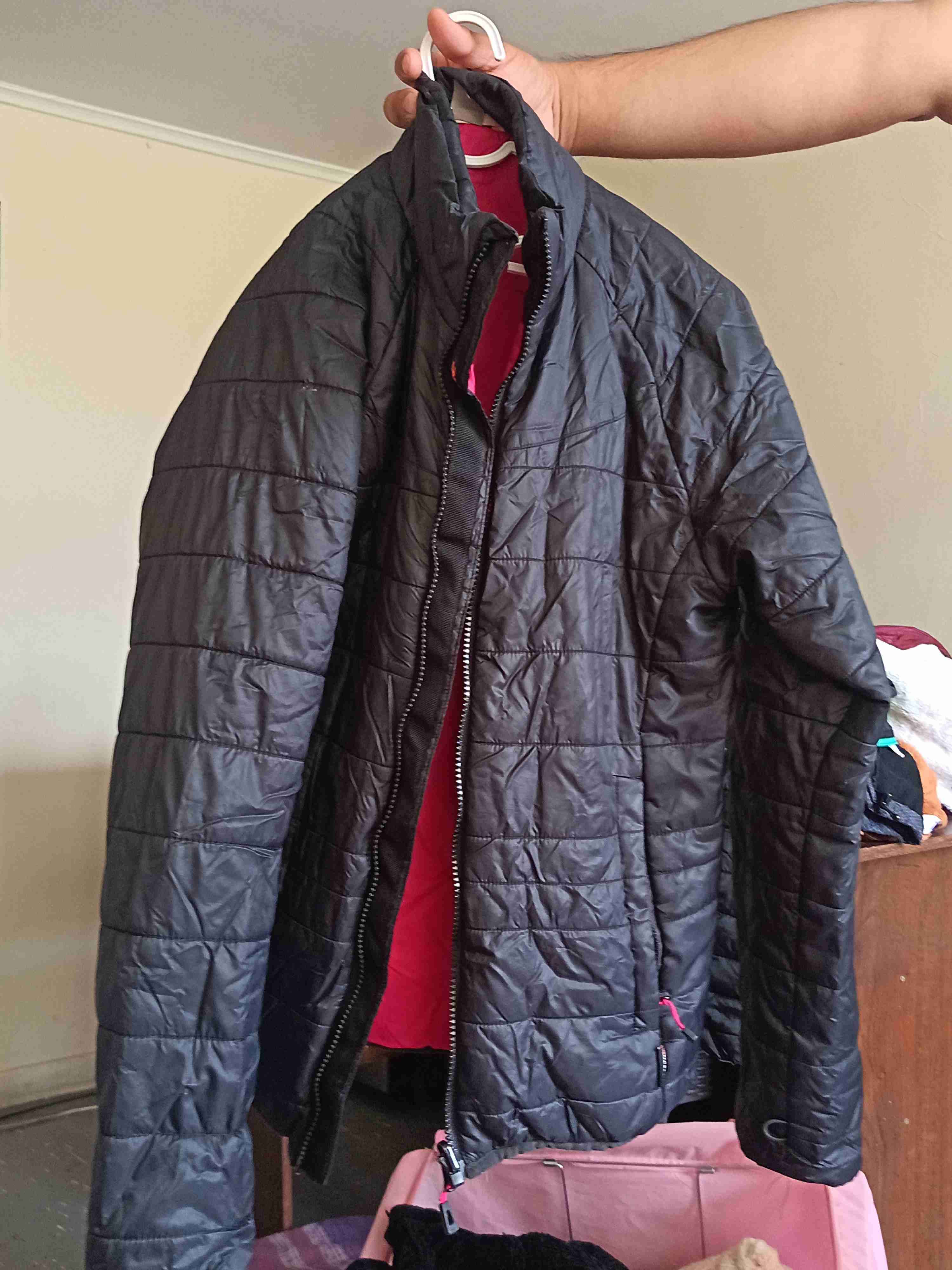 Chaqueta acolchada negra en buen estado, ideal para el invierno. Diseño práctico y moderno.