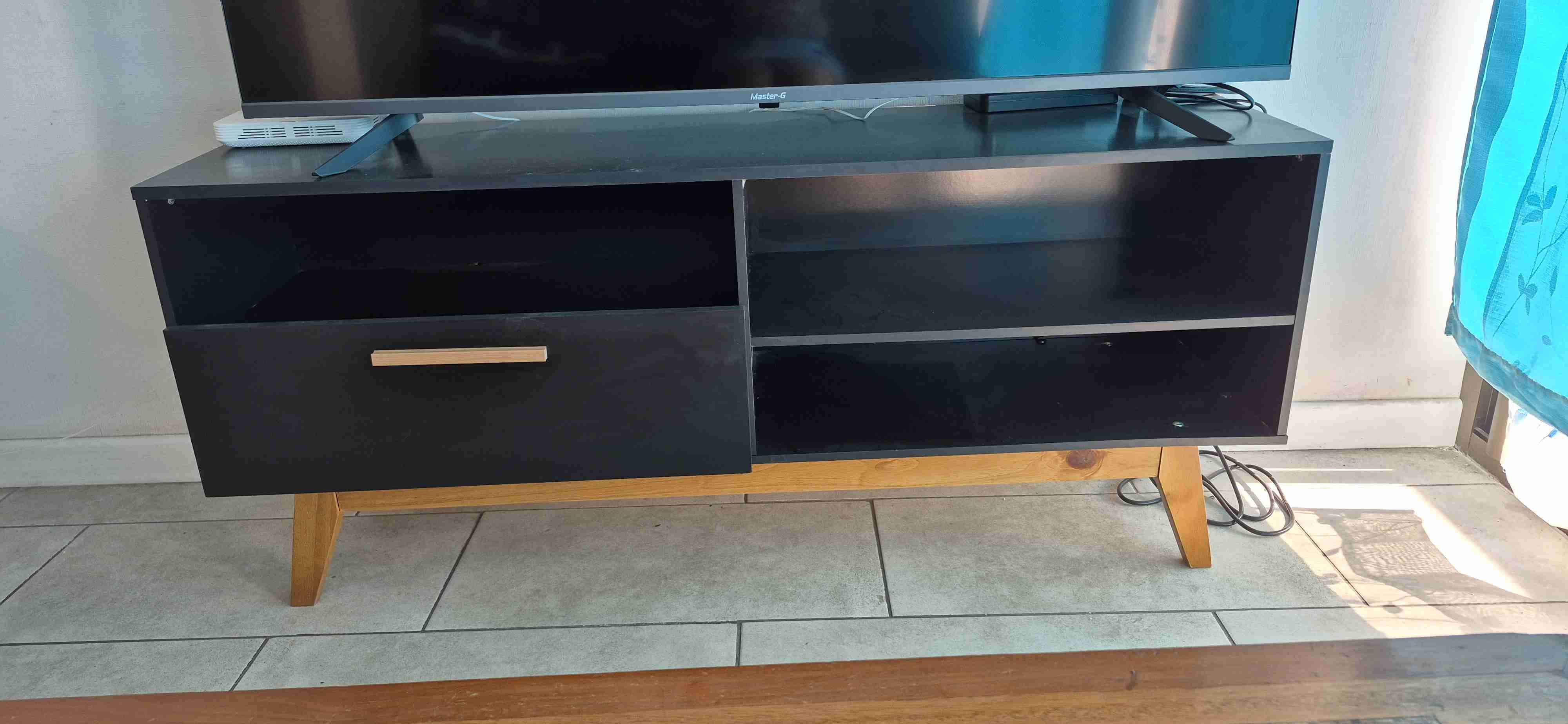 Rack de TV en buen estado, con diseño moderno y elegante. Ideal para aprovechar el espacio en tu sala de estar.