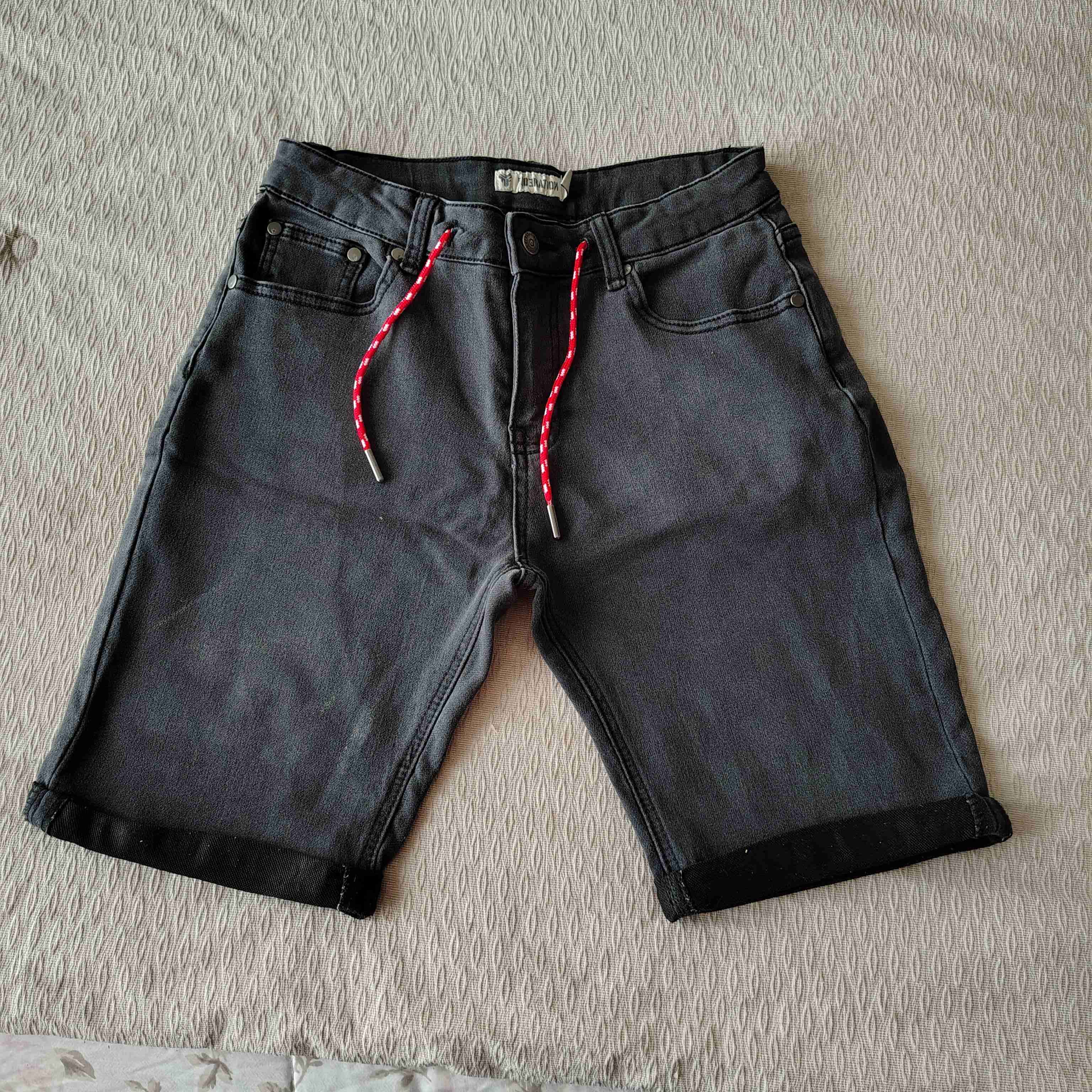 Bermudas negras marca Federation, talla 12, con cordones rojos, ideales para un look casual. En buen estado, perfectas para el verano.