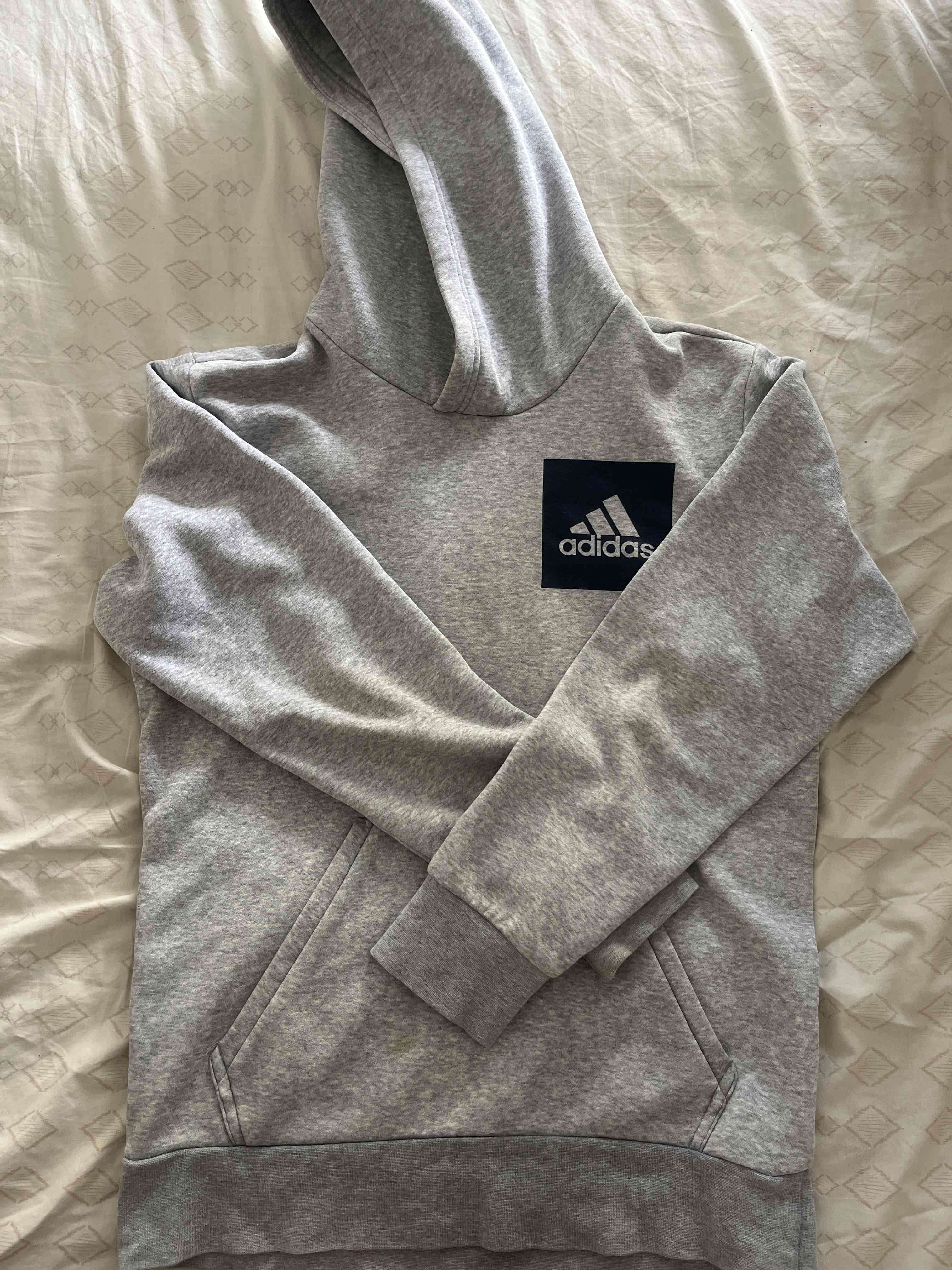 Polerón Adidas gris con etiqueta, ideal para el día a día. En buen estado, con leves signos de uso como en la última foto.