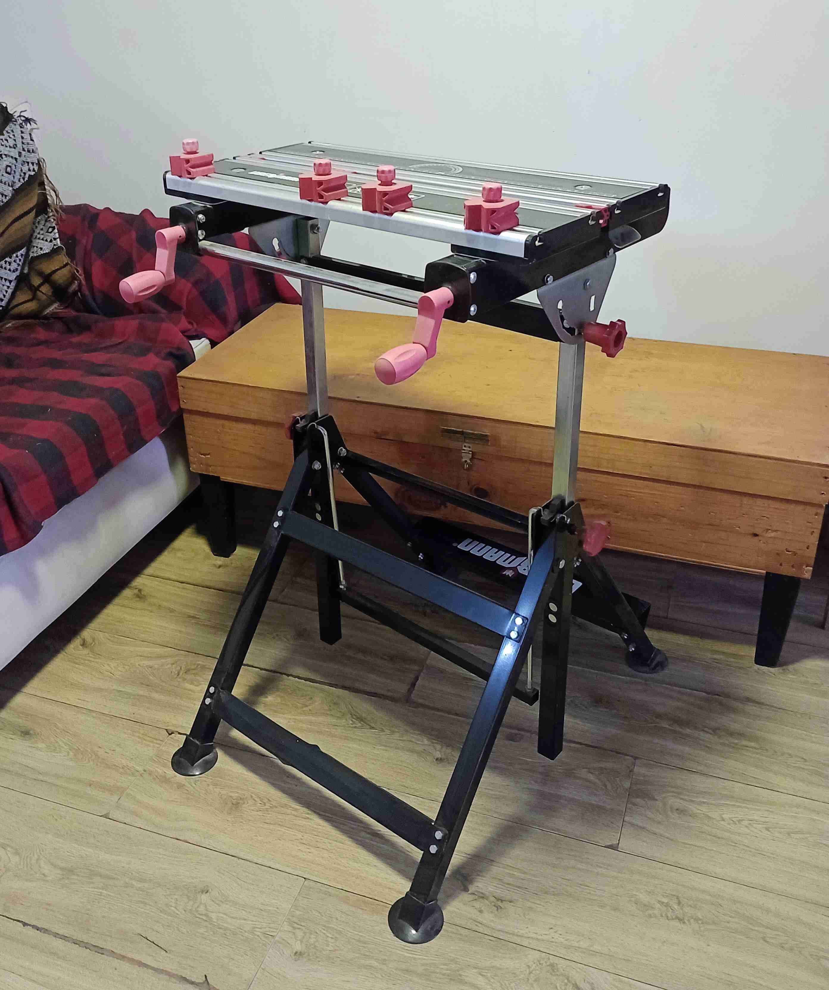 Banco de trabajo portátil y ajustable, multiuso, ideal para tareas de bricolaje. En buen estado, fácil de guardar y transportar.