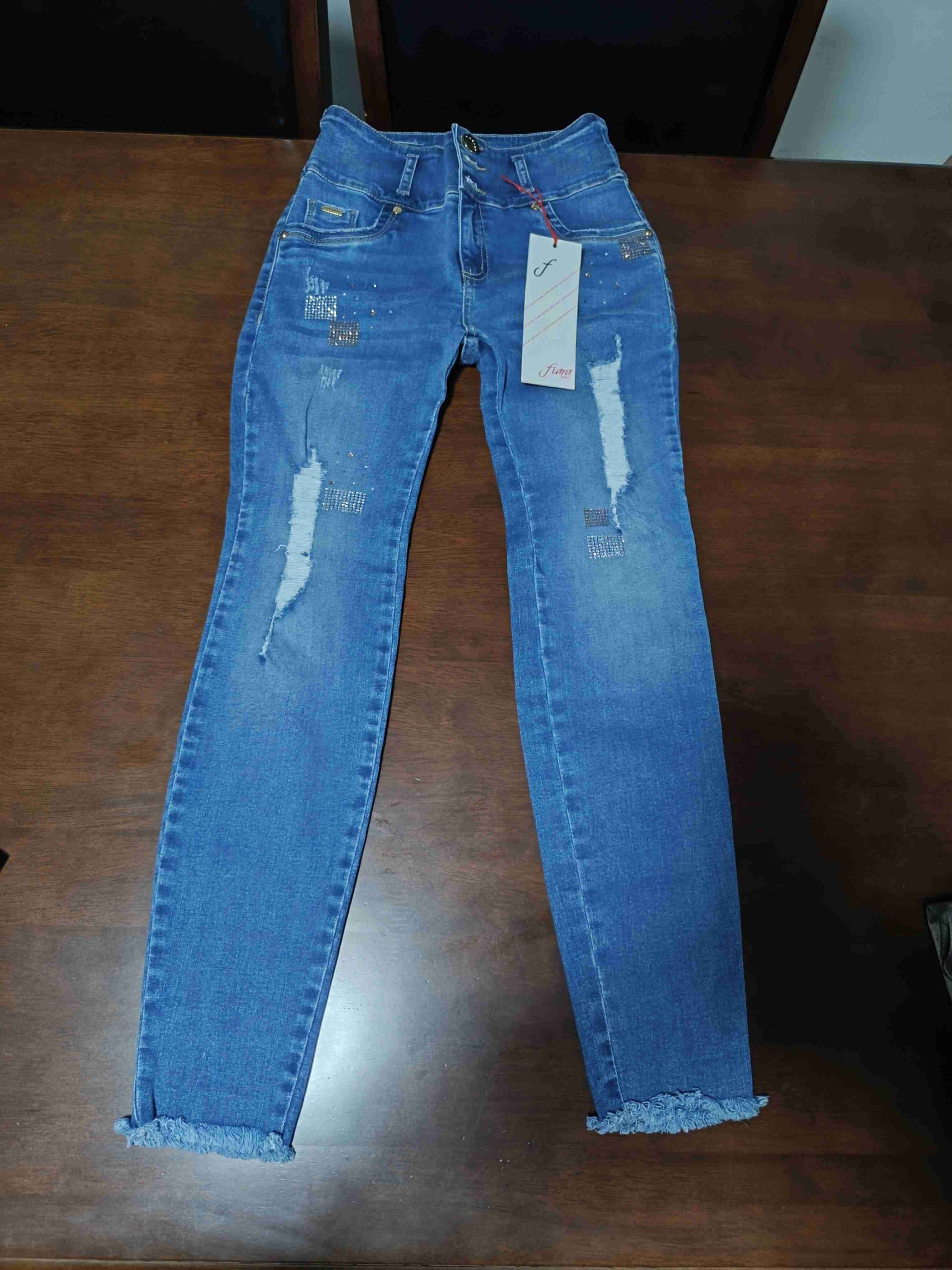 Jeans colombiano de corte moderno con detalles desgastados y apliques brillantes. Ideal para un look casual y juvenil.