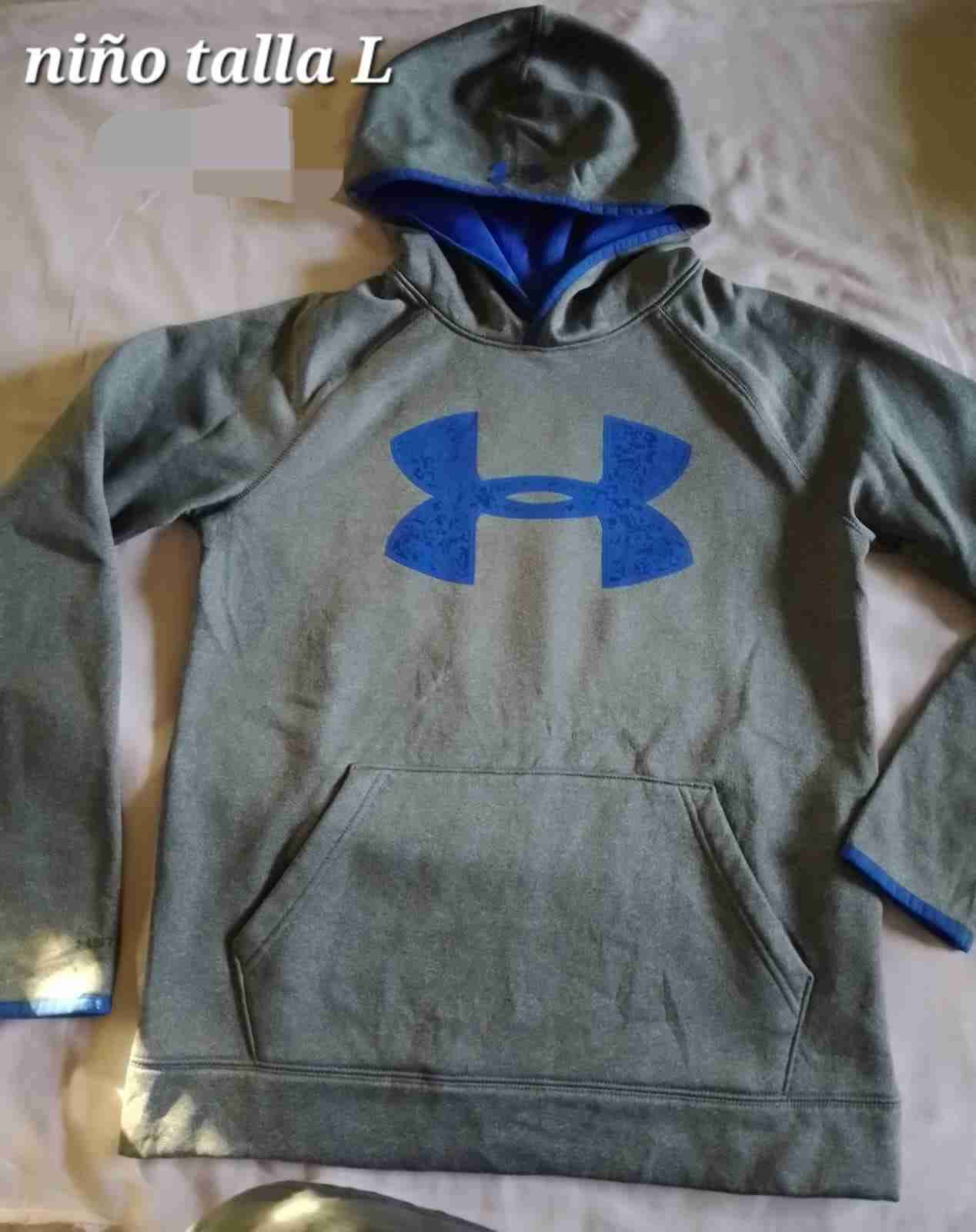 Polerón de niño gris con logo azul, capucha forrada en azul y bolsillo delantero. Ideal para días frescos. Buen estado general.