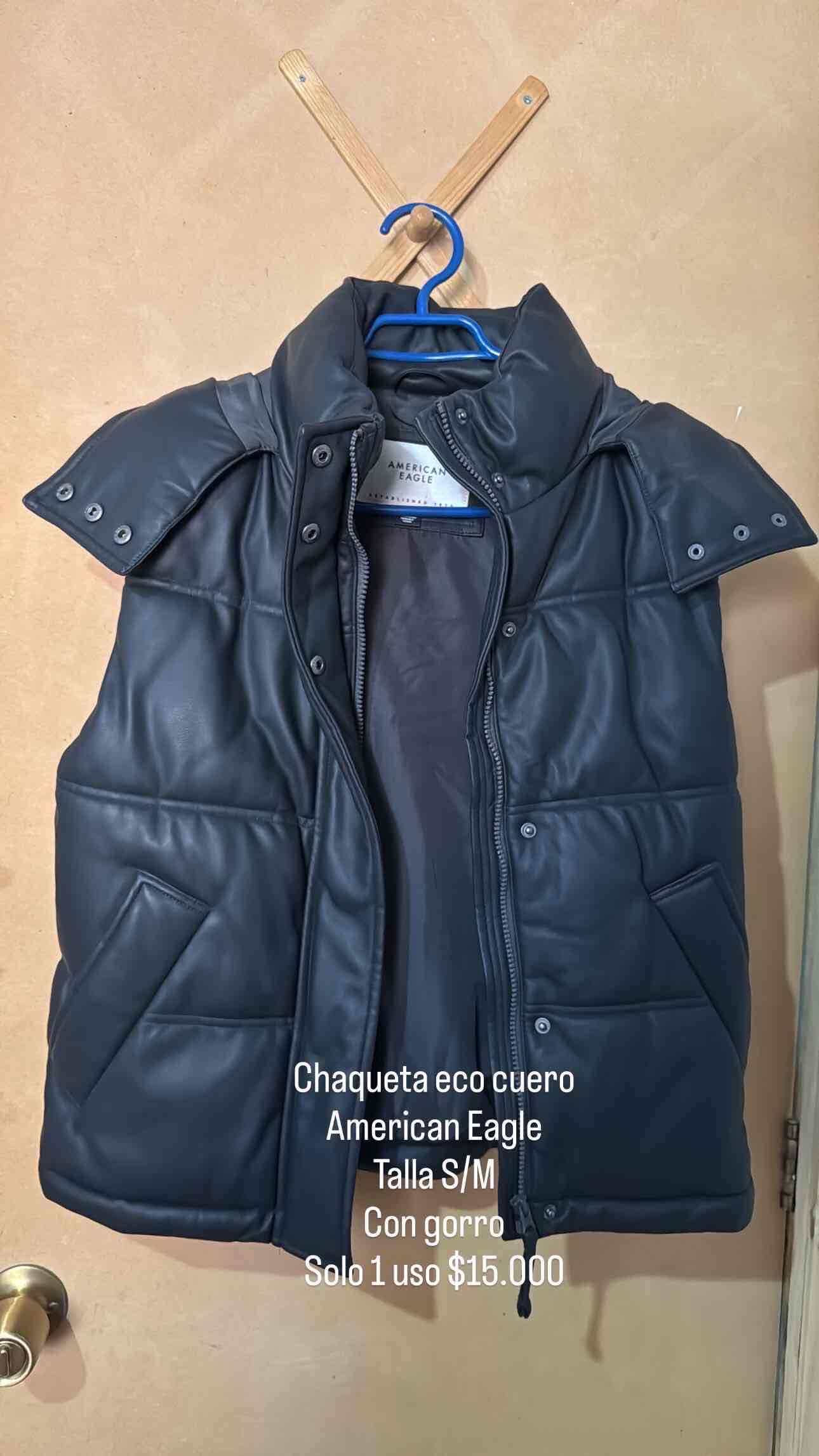 Chaqueta negra de ecocuero con gorro, en buen estado. Ideal para el invierno.