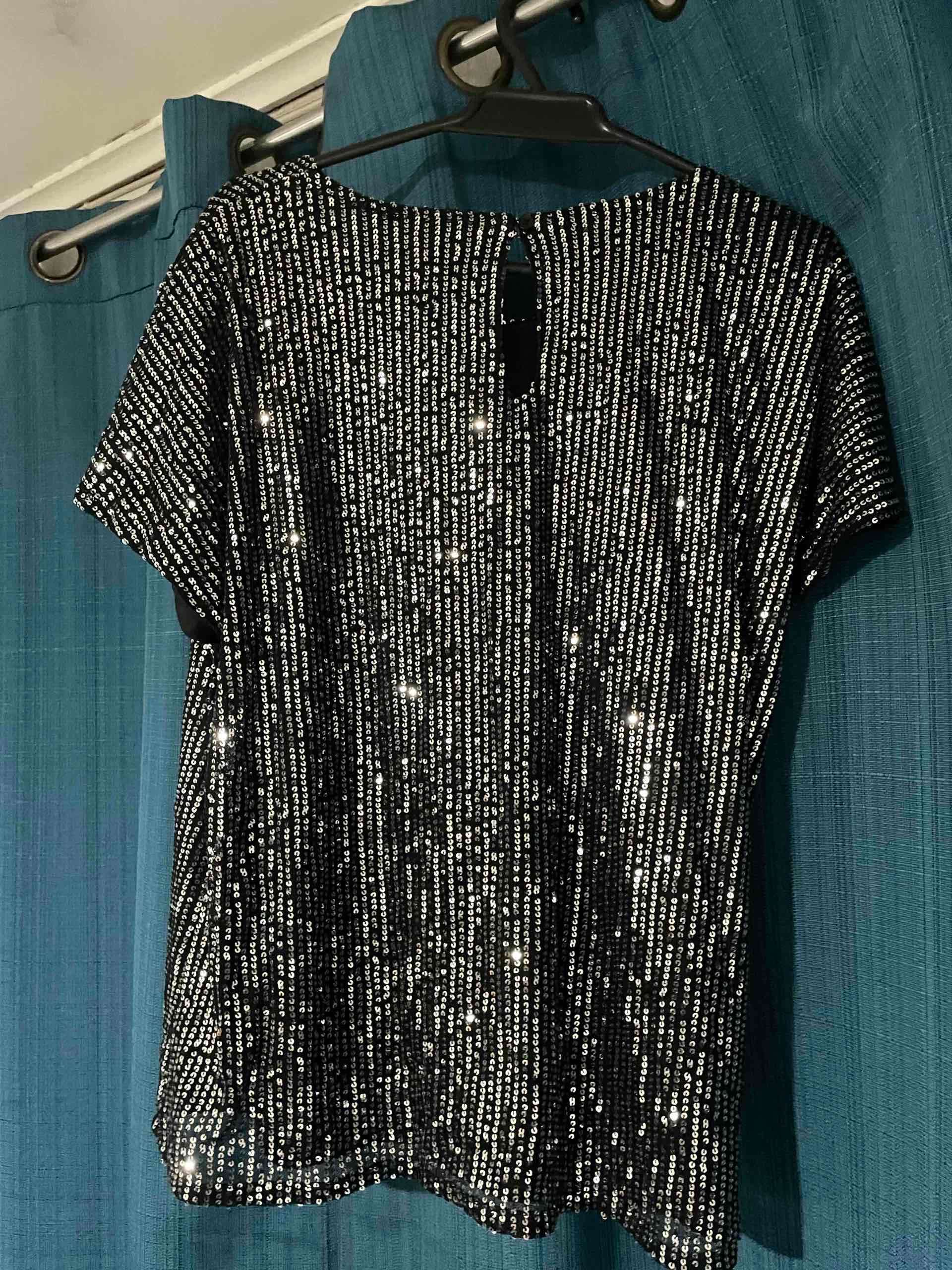 Elegante blusa negra con lentejuelas, perfecta para eventos de noche. En buen estado, brilla mucho bajo la luz .Talla XL