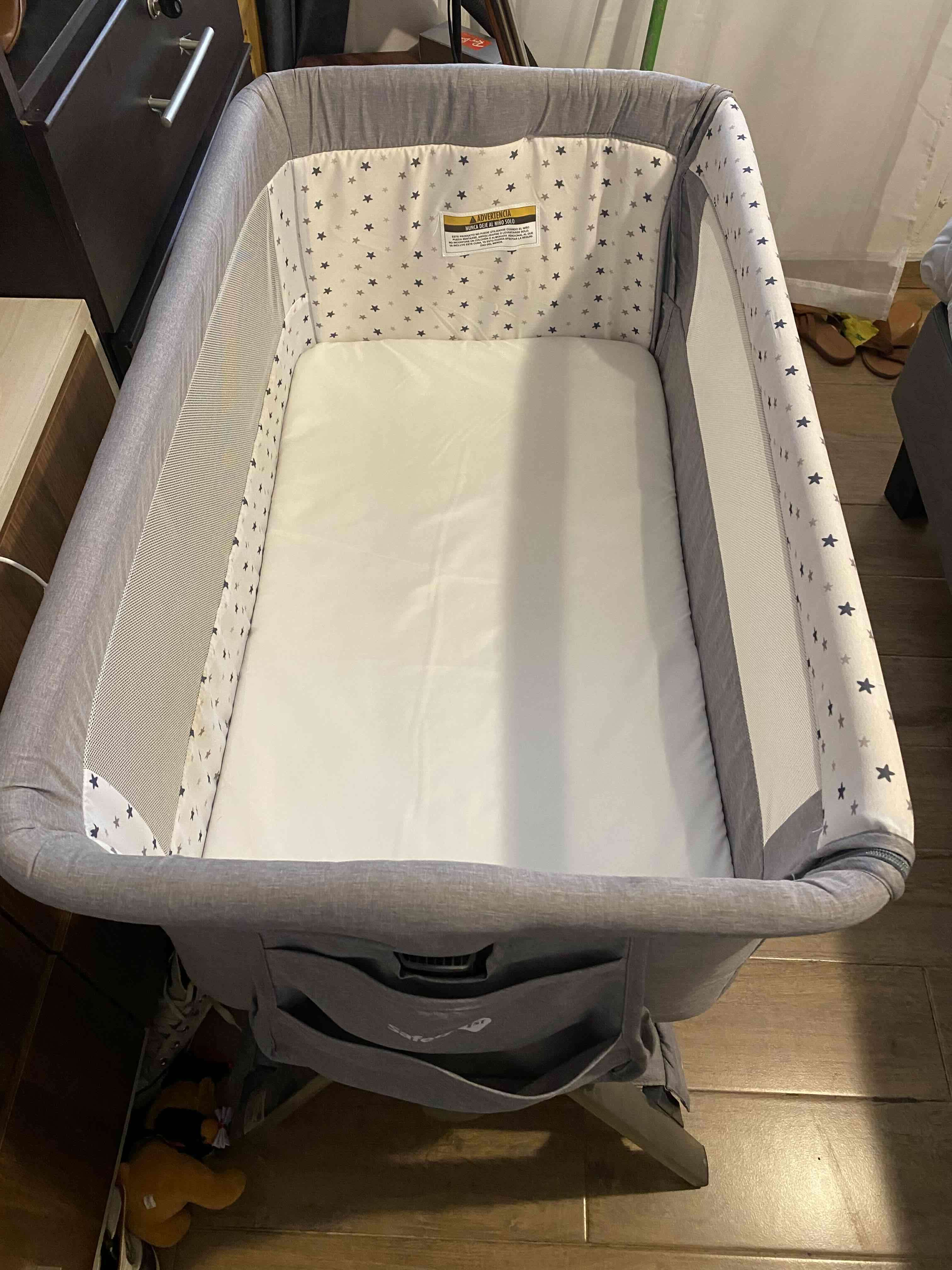 Cuna colecho en excelente estado, color gris con diseño de estrellas. Ideal para el descanso seguro del bebé. Incluye colchón , amarra de seguridad y funda transportadora