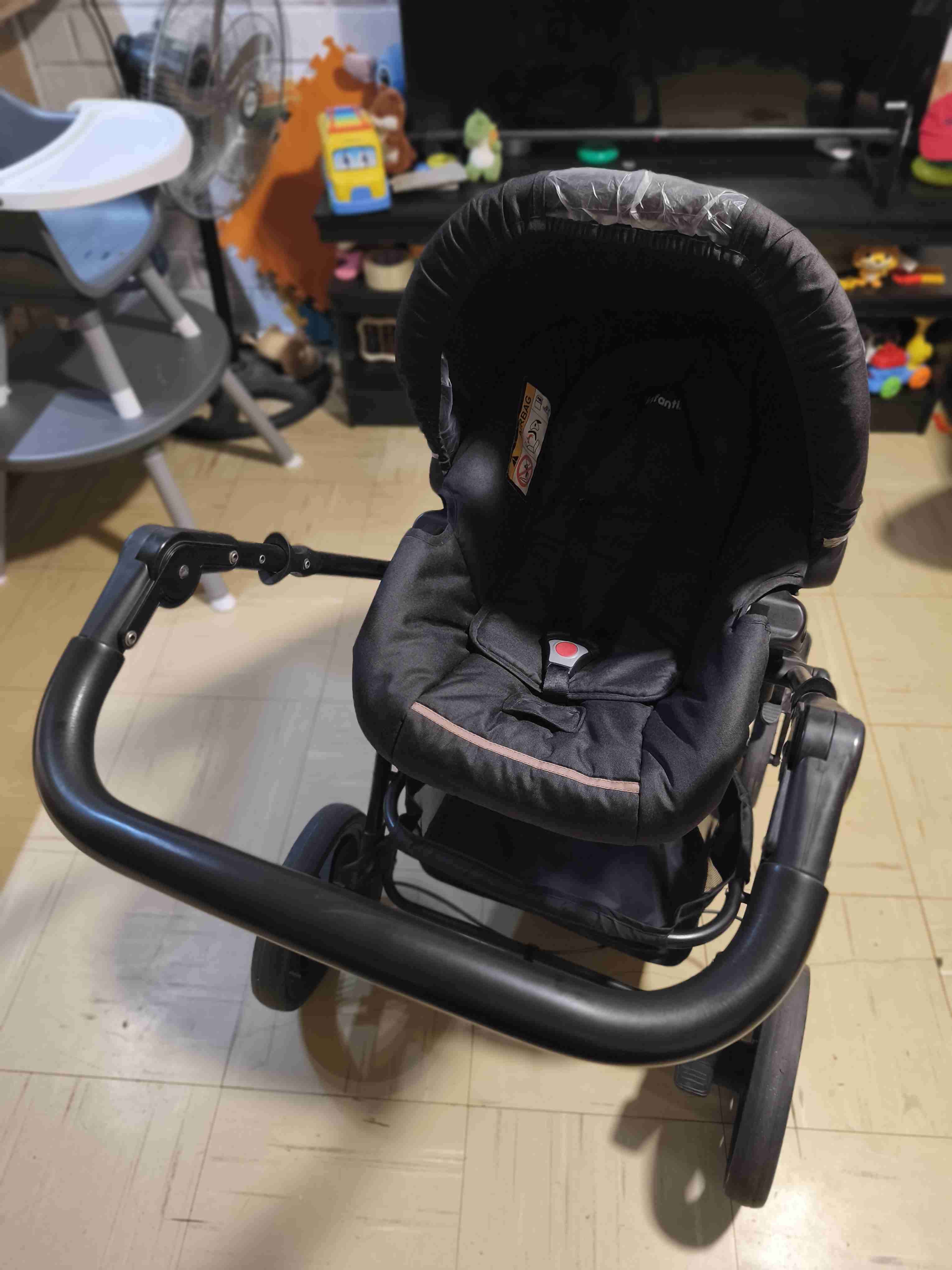 Coche completo para bebé en buen estado, color negro, ideal para paseos cómodos y seguros.