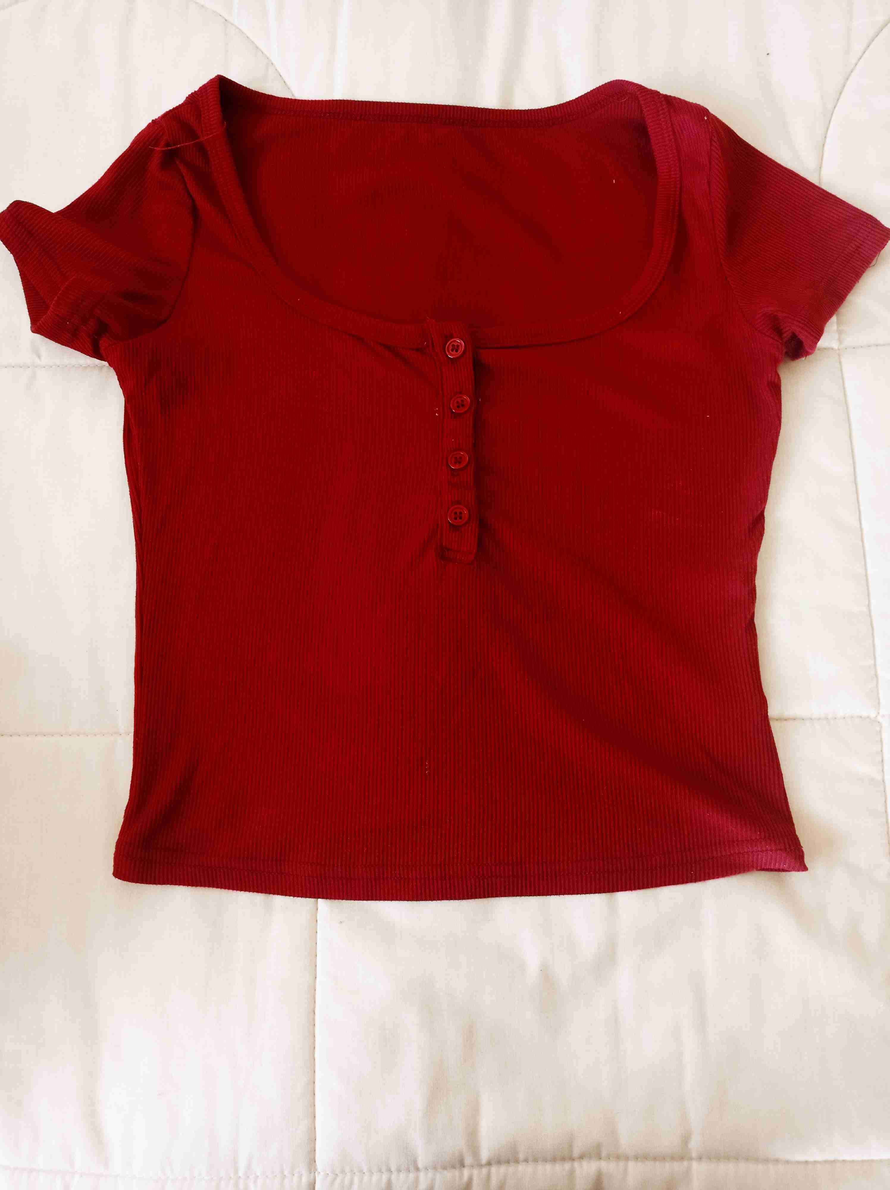 Polera roja de manga corta con botones, ideal para salidas casuales. Se ve en buen estado.