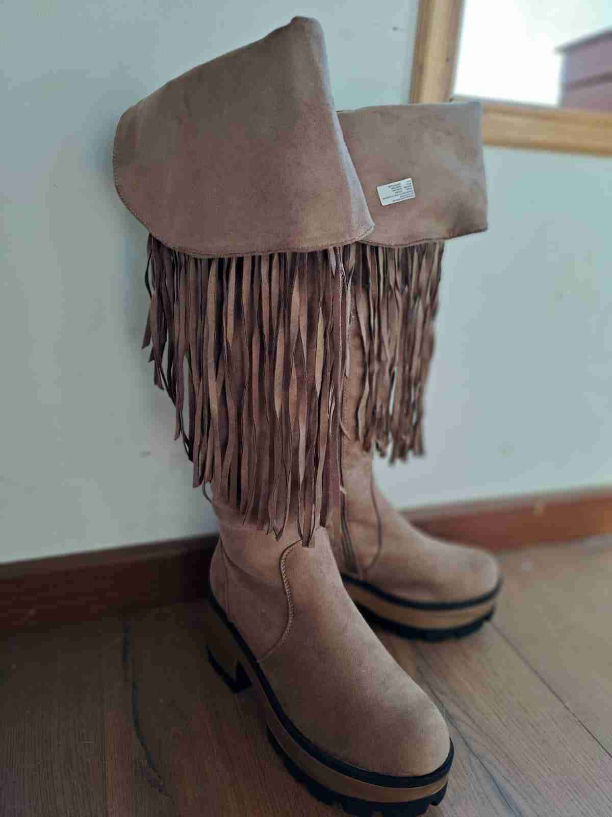 Elegantes botas color camel con flecos decorativos, ideales para un look boho. En buen estado, perfectas para invierno.