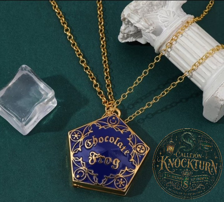 Colgante estilo mágico rana de chocolate en color dorado y azul. Perfecto para amantes de Harry Potter