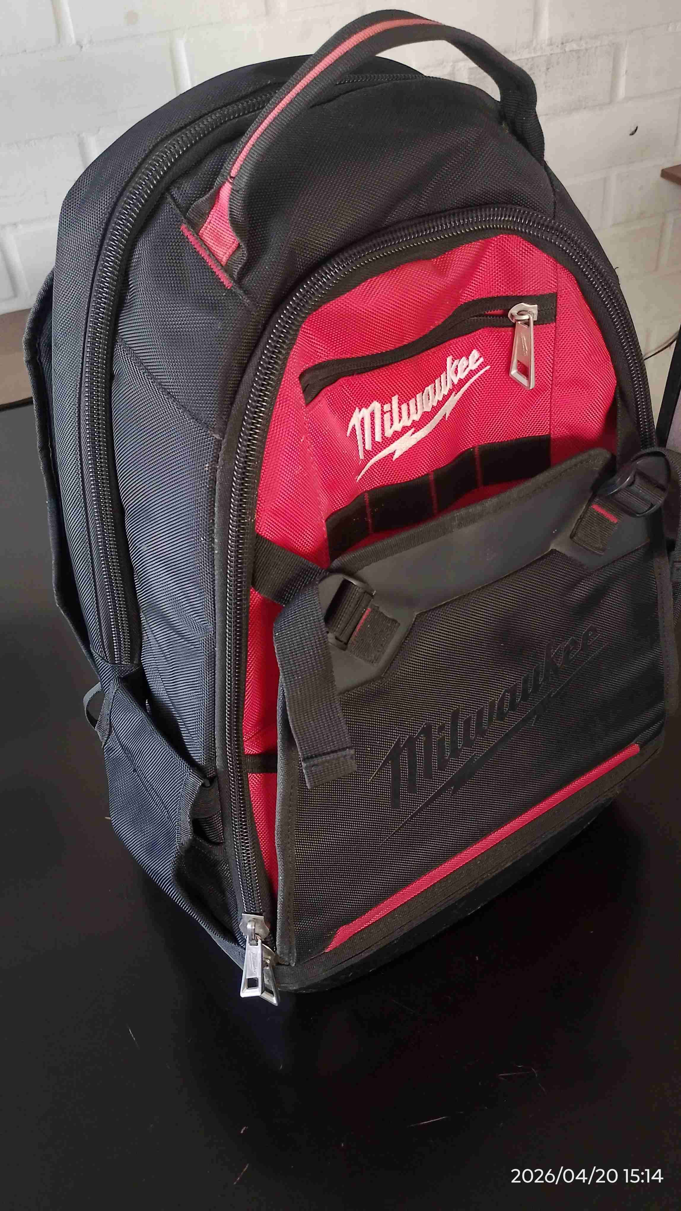 Mochila de alta resistencia ideal para herramientas. En buen estado, color negro y rojo, práctica para transportar equipo.