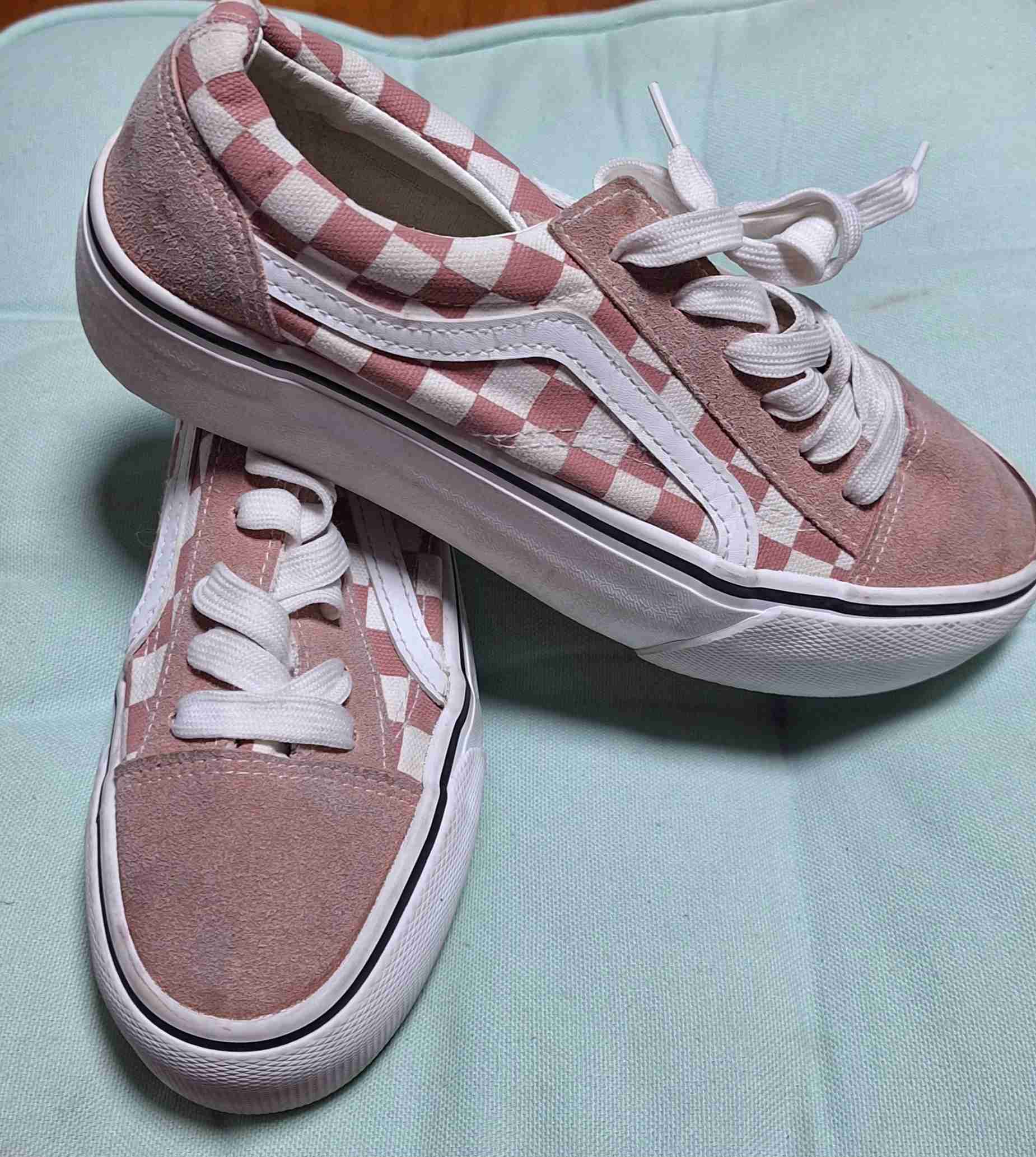 Zapatillas casuales con diseño cuadriculado en tonos rosas y blancos. En buen estado, perfectas para el día a día.
