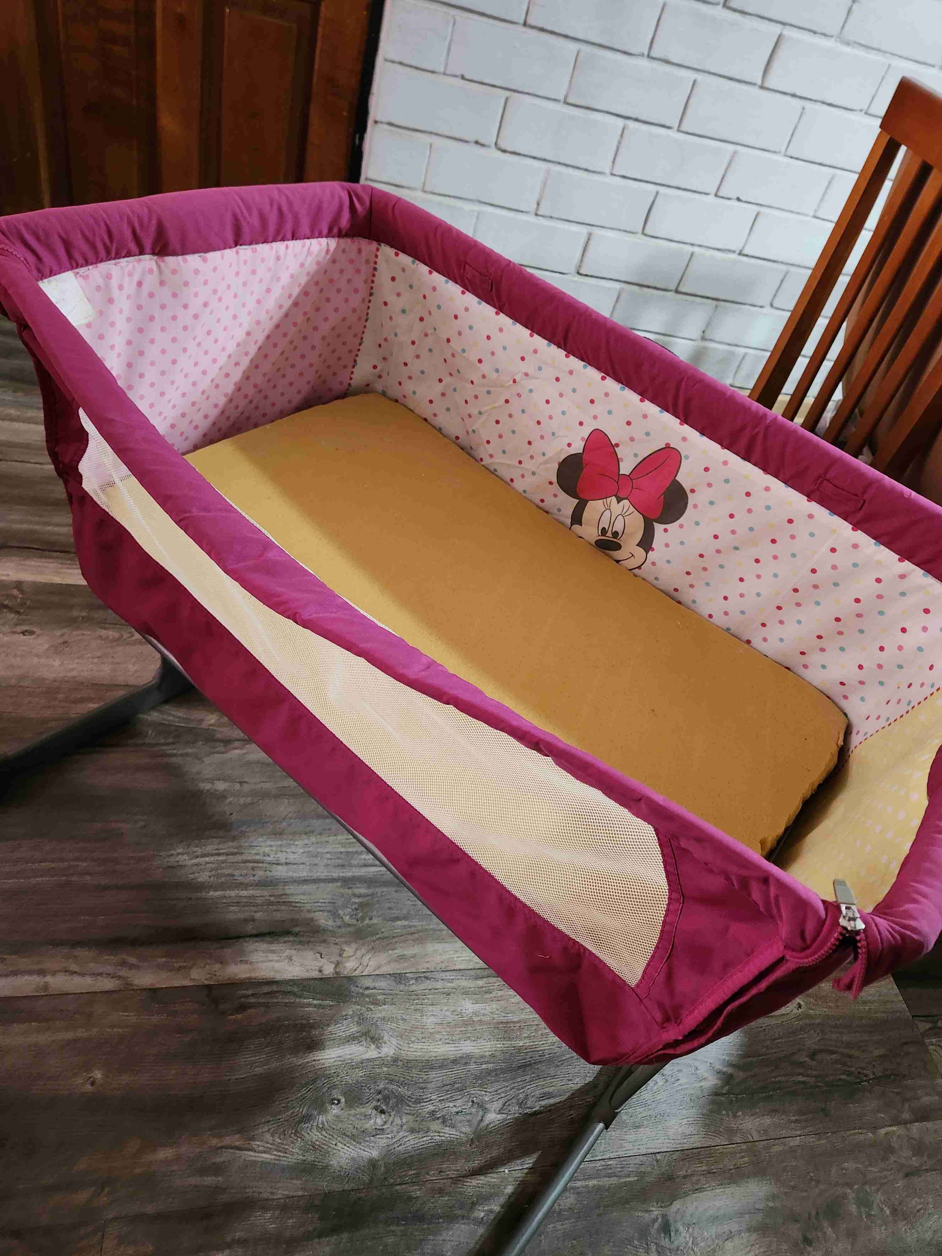 Cuna portátil con diseño de Minnie Mouse en color rosado, ideal para el descanso de los más pequeños. En buen estado, cómoda y segura.