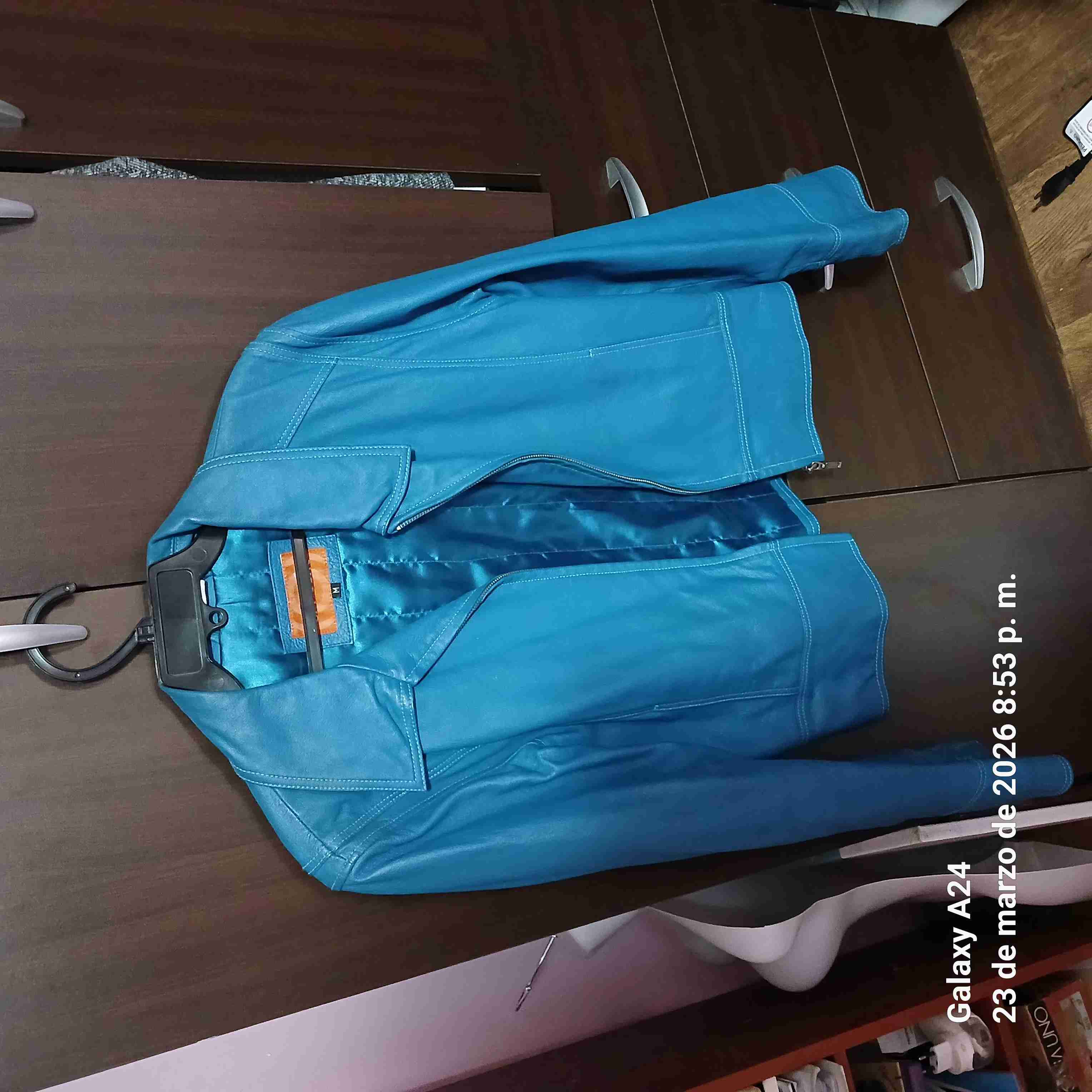 Chaqueta de cuero azul claro ideal para el otoño. Está en muy buen estado con leves signos de uso.