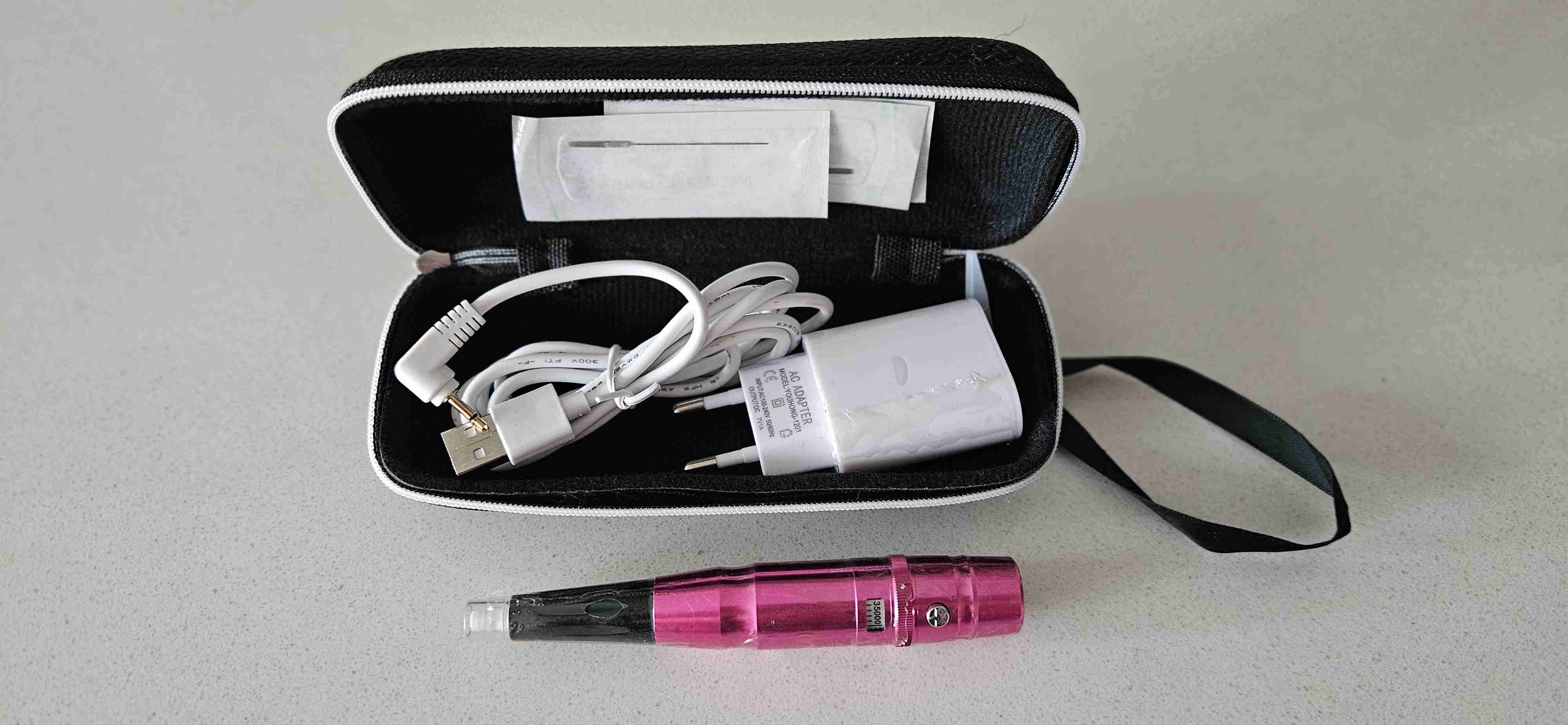 Dermógrafo, una herramienta eléctrica utilizada para realizar procedimientos de micropigmentación y tatuajes cosméticos, como la definición de cejas o labios. Función: Aplica pigmentos en la capa superficial de la piel con alta precisión. Velocidad: El dispositivo que aparece en la imagen muestra una configuración de hasta 35.000 revoluciones por minuto. Componentes: Incluye una máquina tipo pluma (rotativa), adaptador de corriente, cable de conexión y agujas desechables. Incluye cable de corriente original y estuche. Sin uso