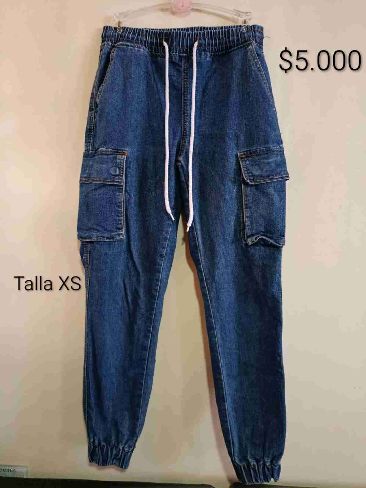 Pantalones cargo en denim azul, estilo casual con bolsillos laterales. Buen estado, ideales para uso diario.