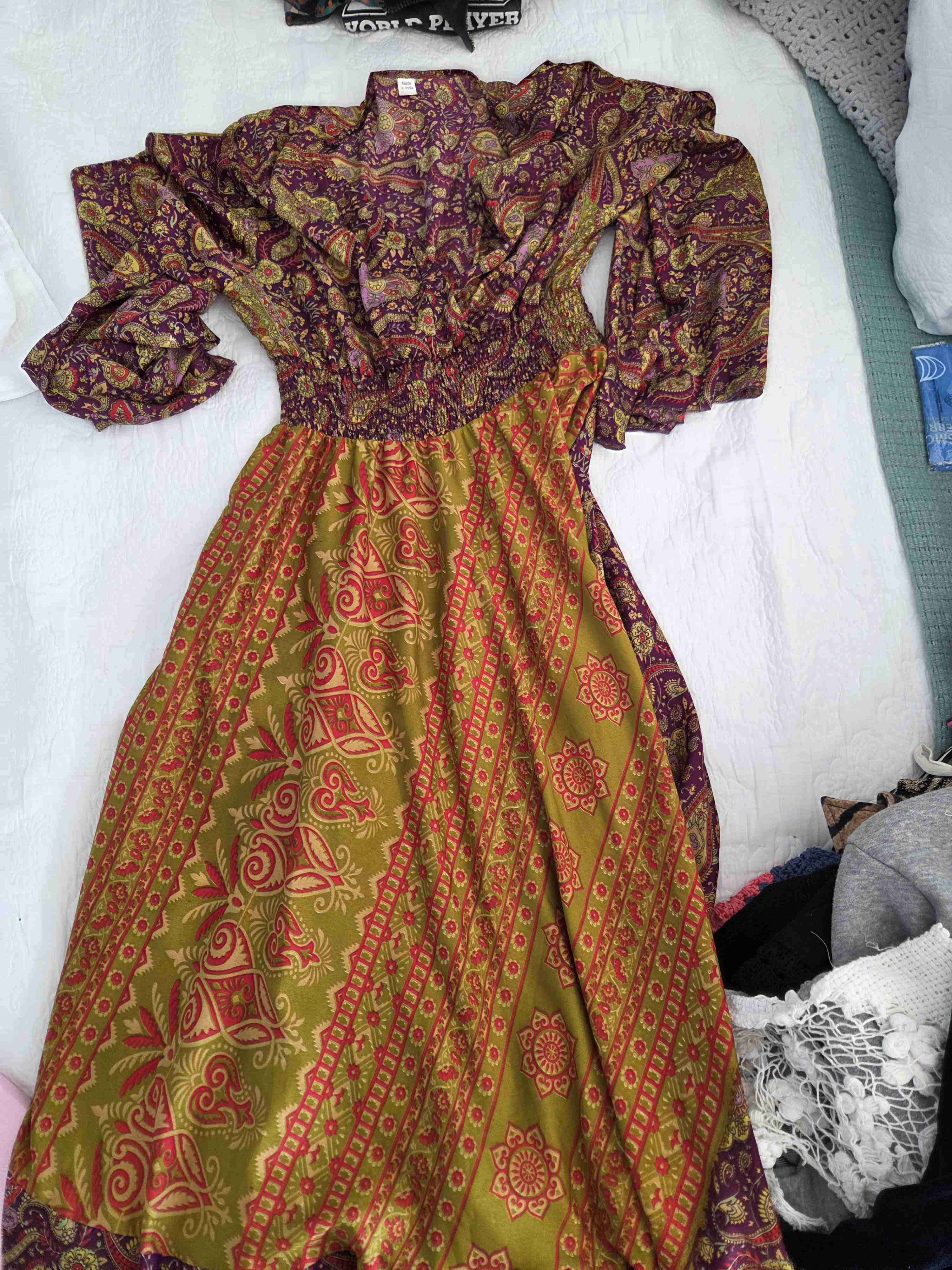 Vestido largo con estampado bohemio en colores vivos. Ideal para ocasiones casuales o festivas. En buen estado.