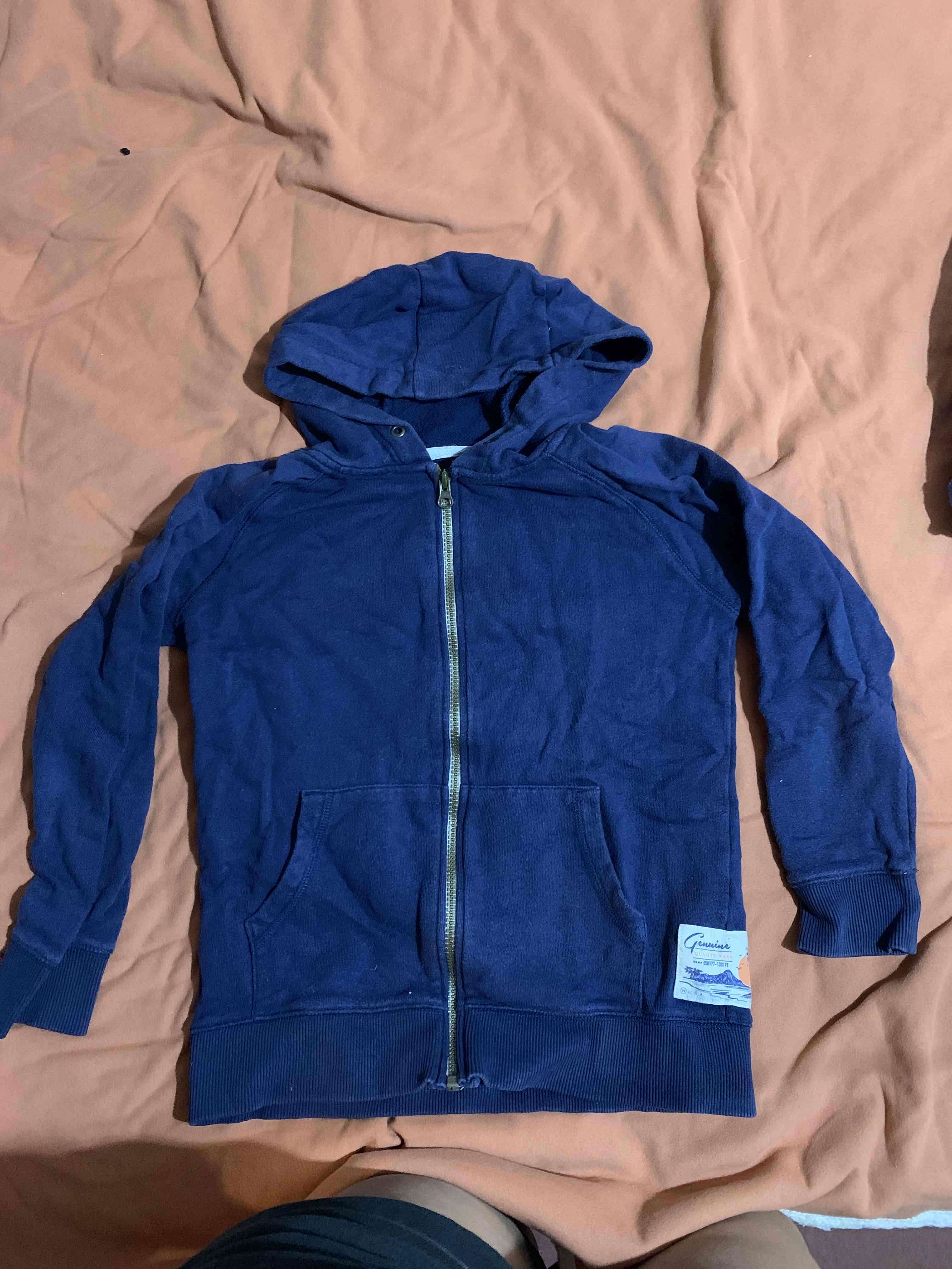 Polerón azul con cierre completo y capucha. Ideal para días frescos. Talla 8