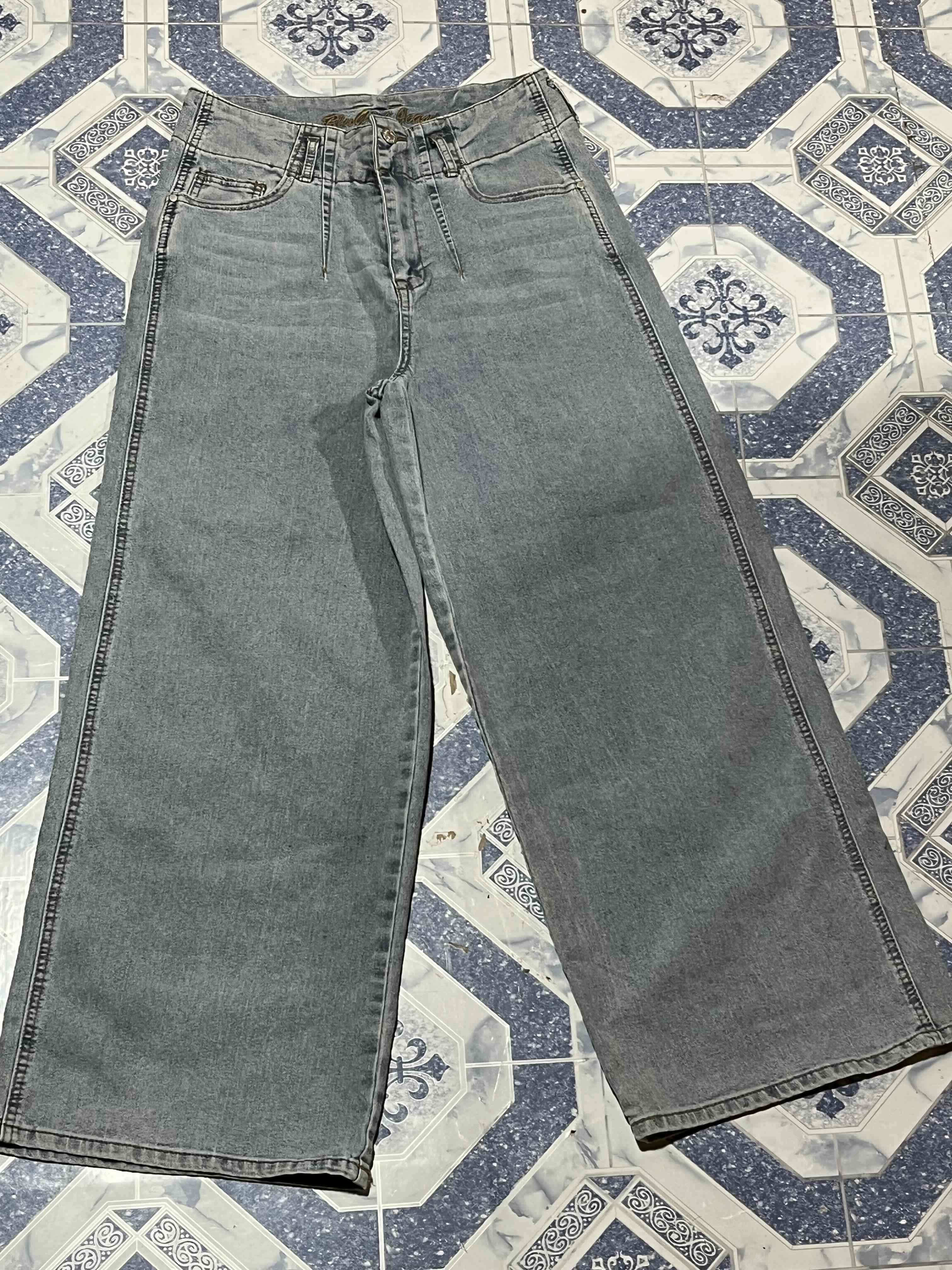 Jeans gris de tiro alto en buen estado, ideal para estilos casuales y urbanos.
