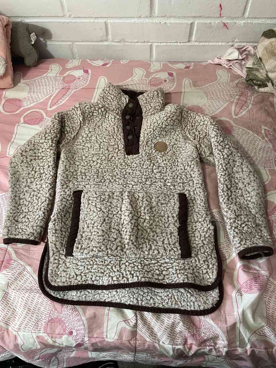 Cálido polerón de lana con cierre de botones, ideal para el invierno. En buen estado con pequeño desgaste. Talla 10
