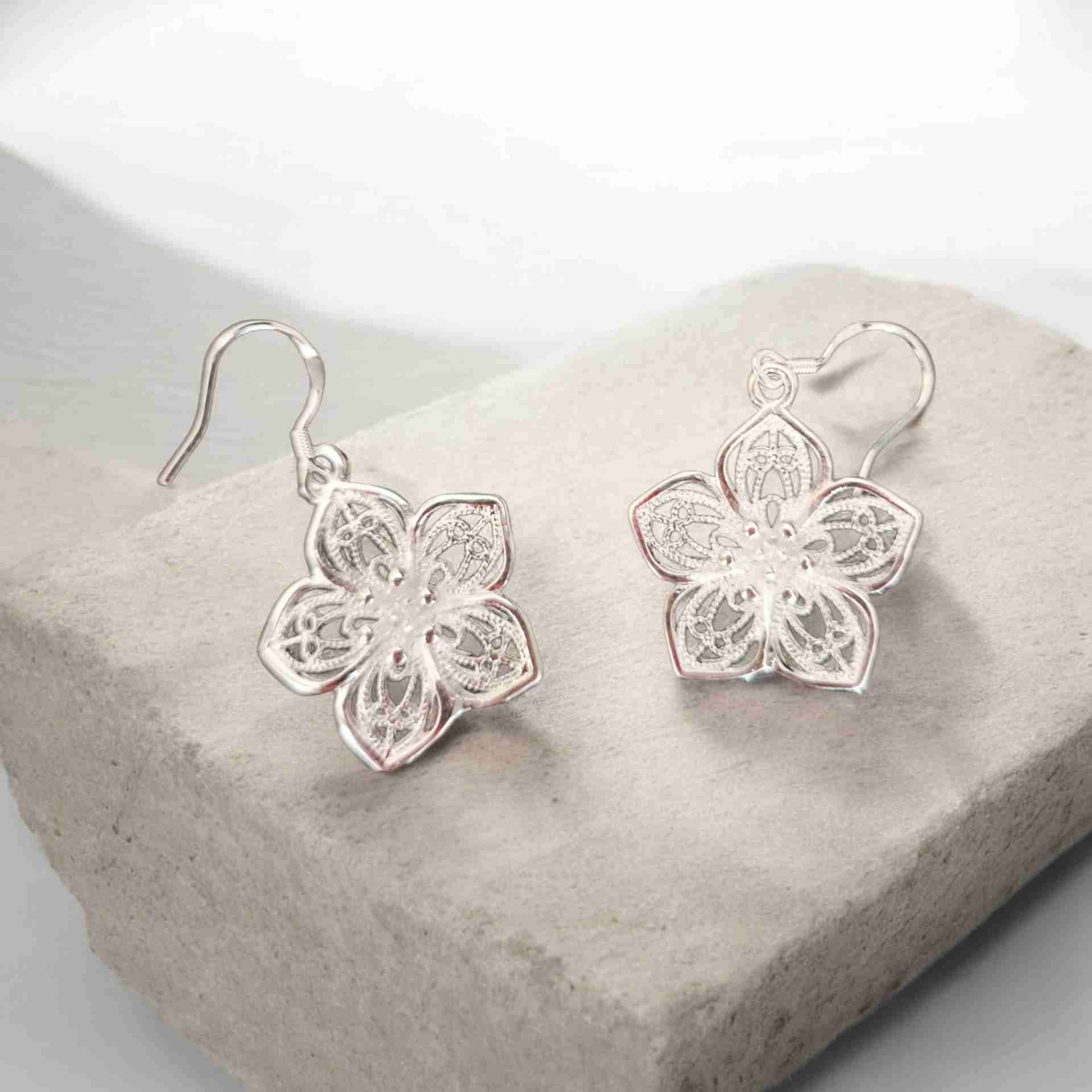 Elegantes aros con diseño de flor en baño de plata. Ideales para ocasiones especiales, en excelente estado.