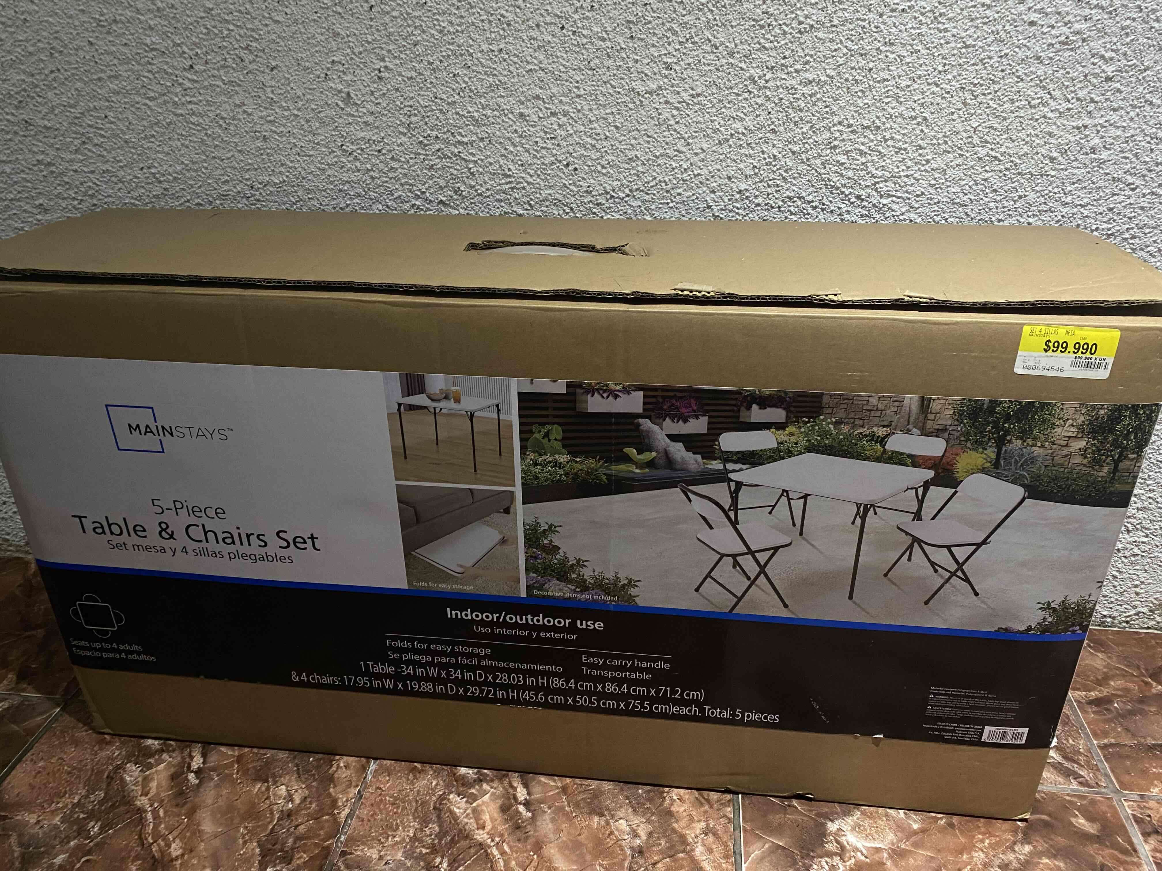 Set de 5 piezas para interior y exterior, ideal para reuniones. Incluye una mesa plegable y cuatro sillas. Nuevo en caja.