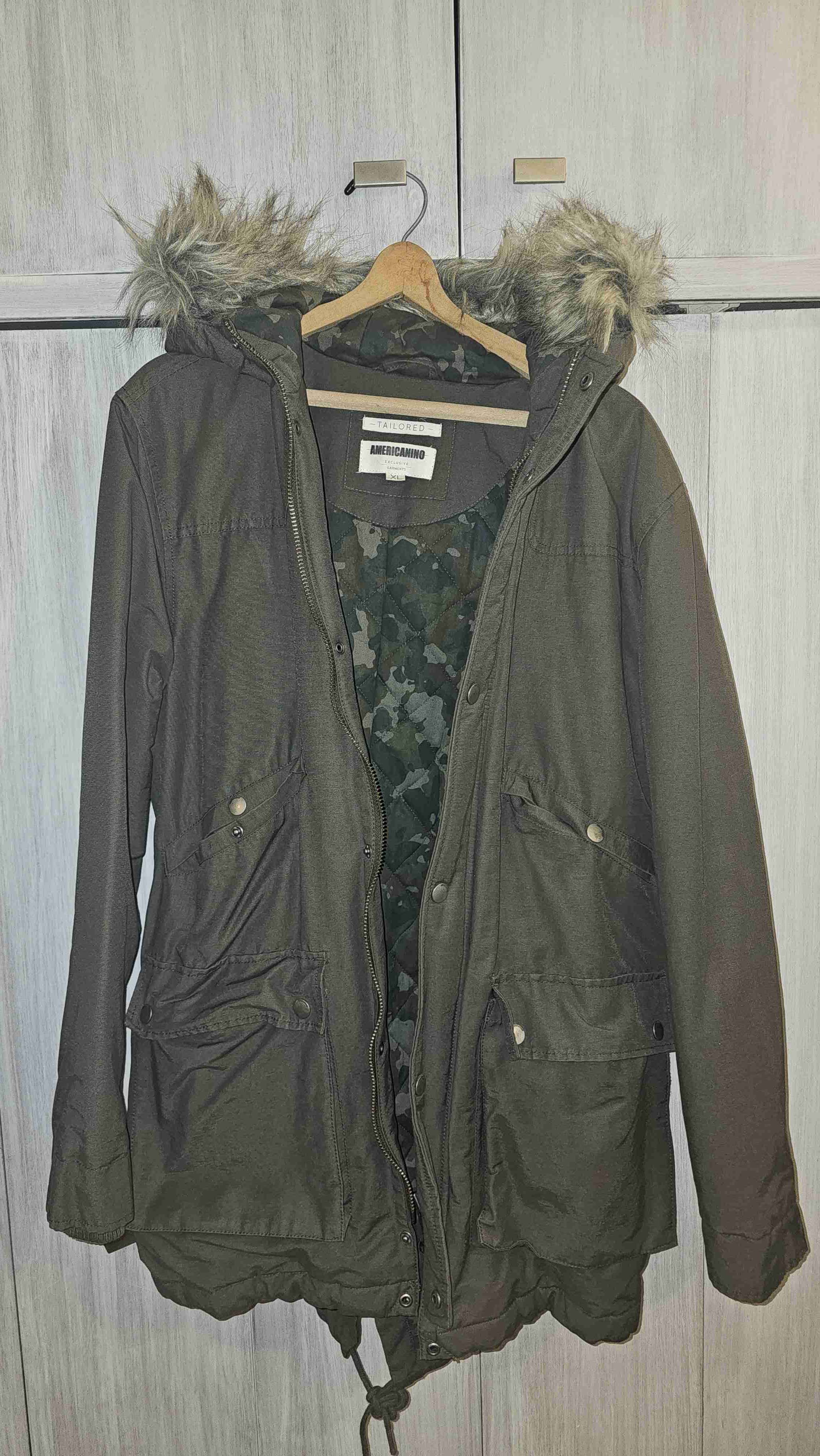 Chaqueta larga talla XL marca Americanino. Muy abrigada, resistente al agua y con exterior peludo de capucha removible. Medidas: 90 cm de largo 62cm de ancho 70cm de brazo