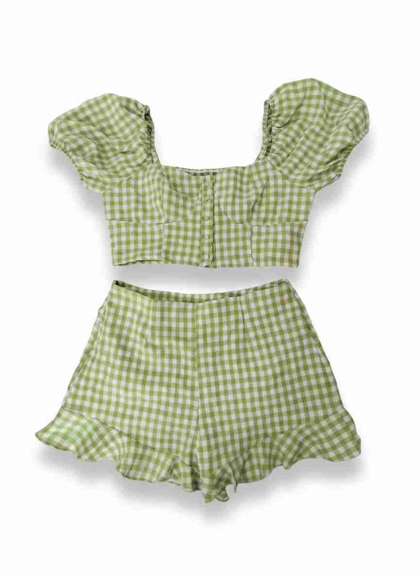 Conjunto veraniego de dos piezas, ideal para días cálidos. Diseño a cuadros con colores vivos y volantes. Tela fresca.