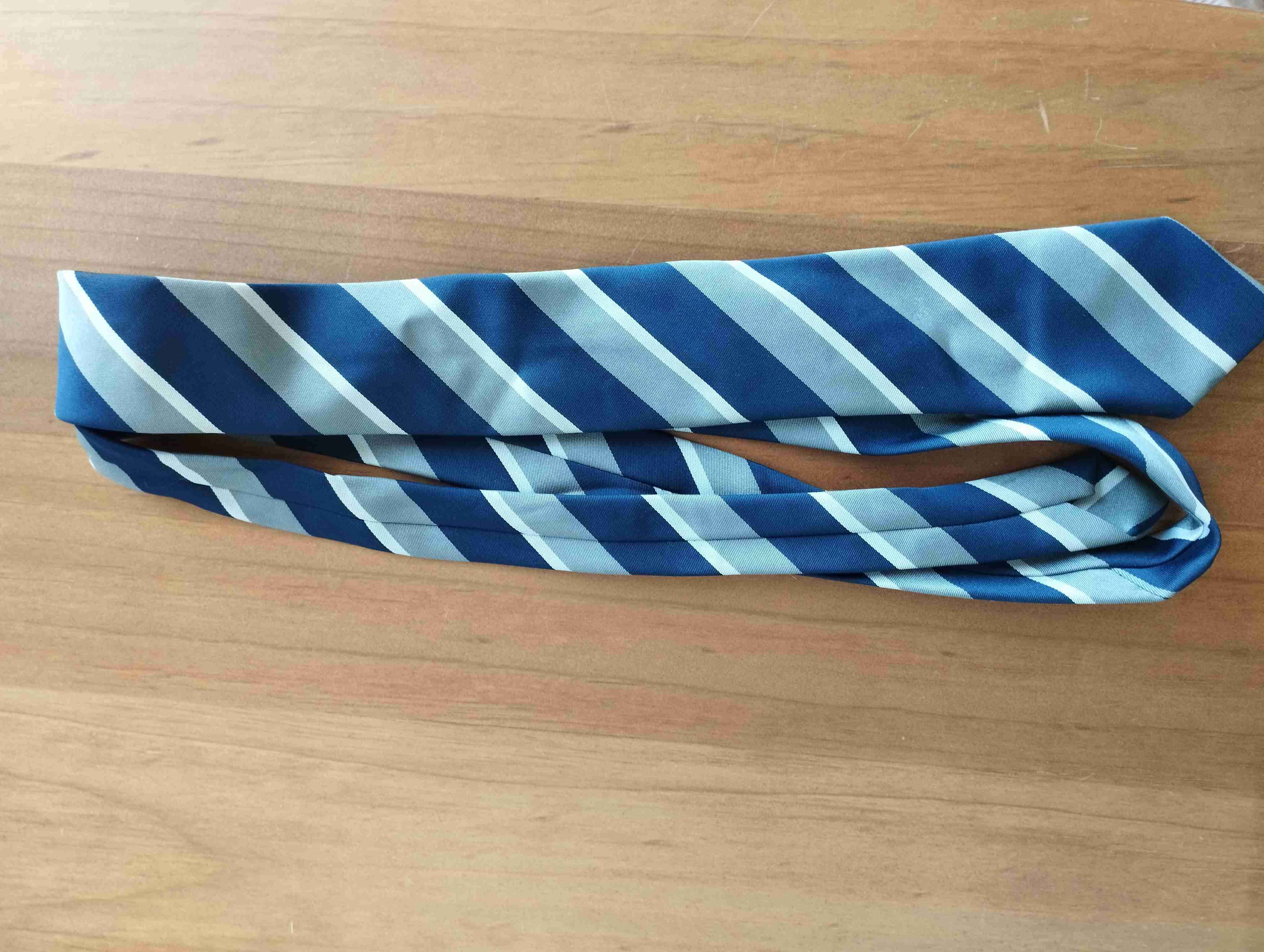 Elegante corbata de rayas azules y grises, ideal para ocasiones formales. En buen estado.
