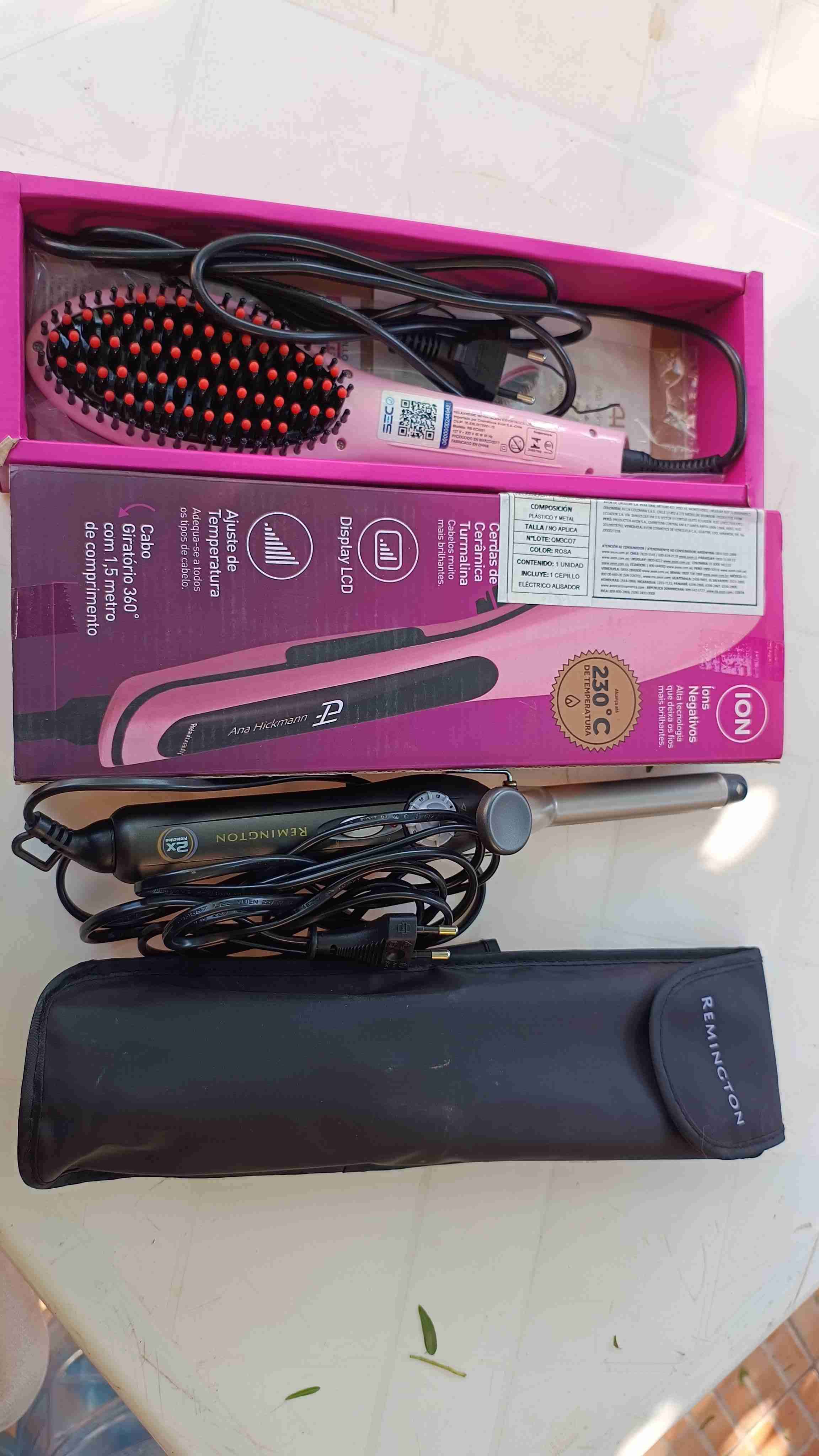 Set de plancha y cepillo para el cabello. Incluye plancha Remington y cepillo iónico con cerámica turmalina, ideal para un alisado perfecto. Buen estado general.