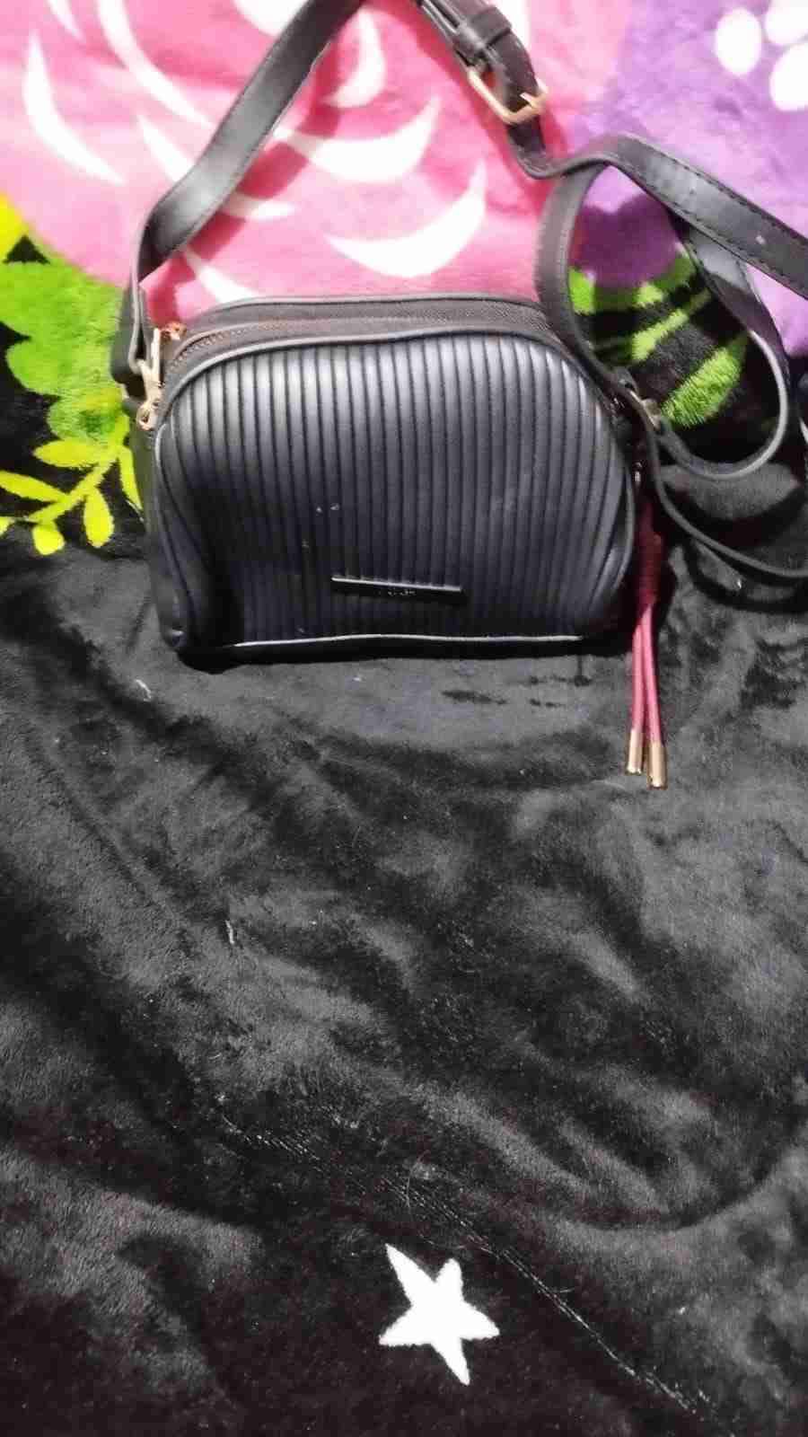 Cartera negra con diseño acanalado. En buen estado, ideal para uso diario. Incluye correa ajustable.