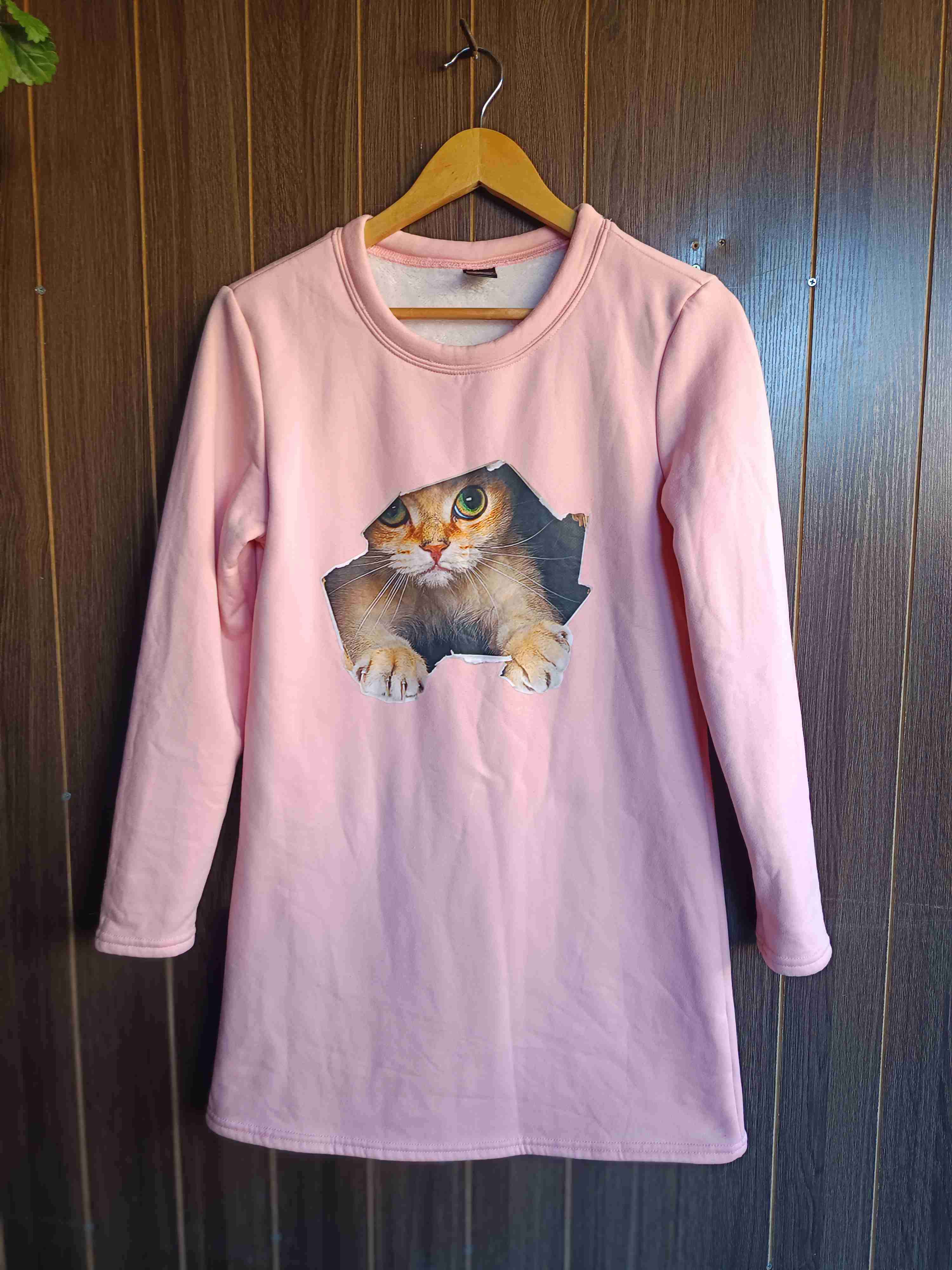 Vestido casual rosado con un llamativo diseño de gato. En buen estado, ideal para ocasiones informales.