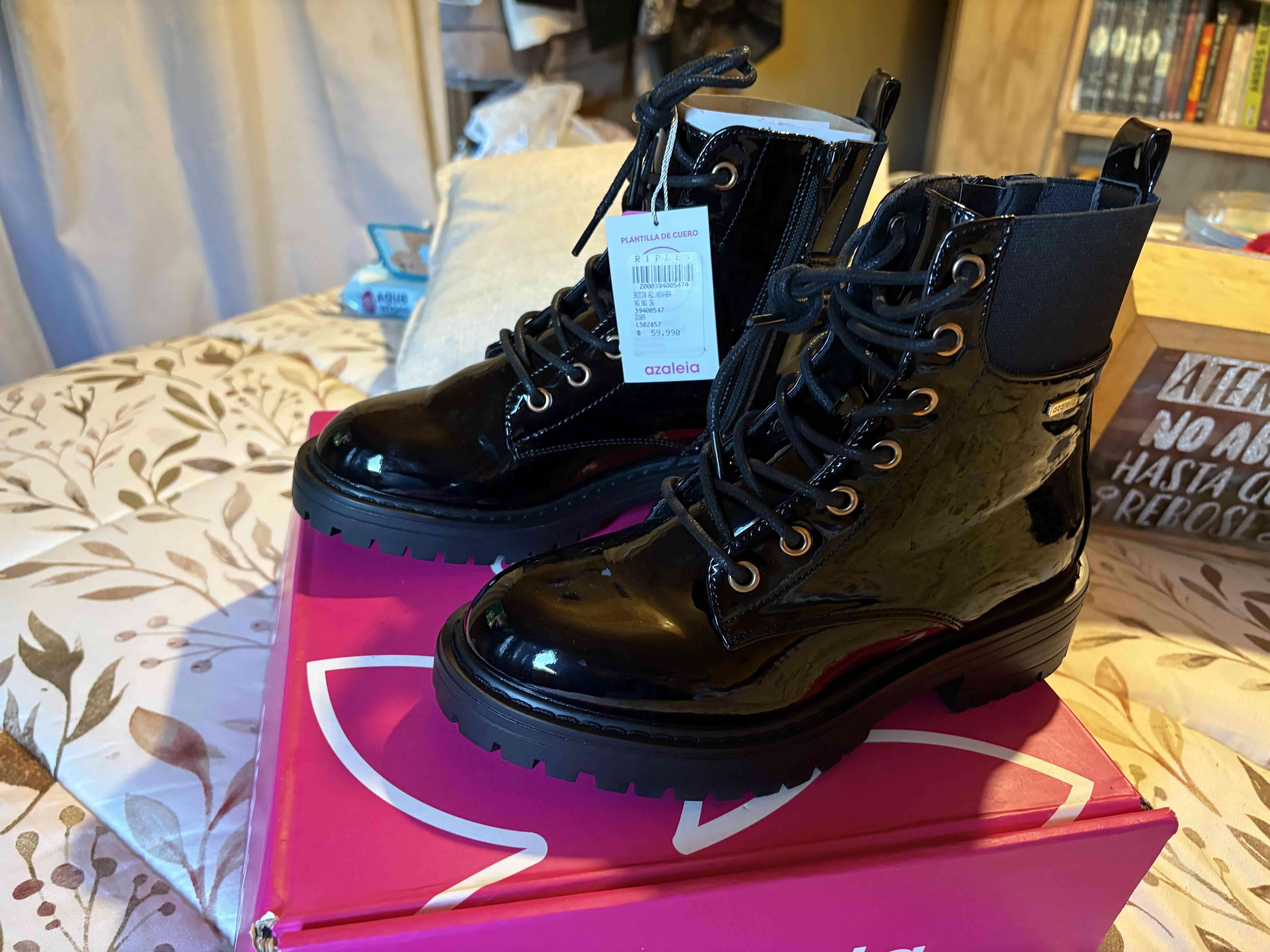 Elegantes botines de charol negro con suela gruesa. Estado impecable, etiqueta original aún presente. Perfectos para un look casual o más formal.