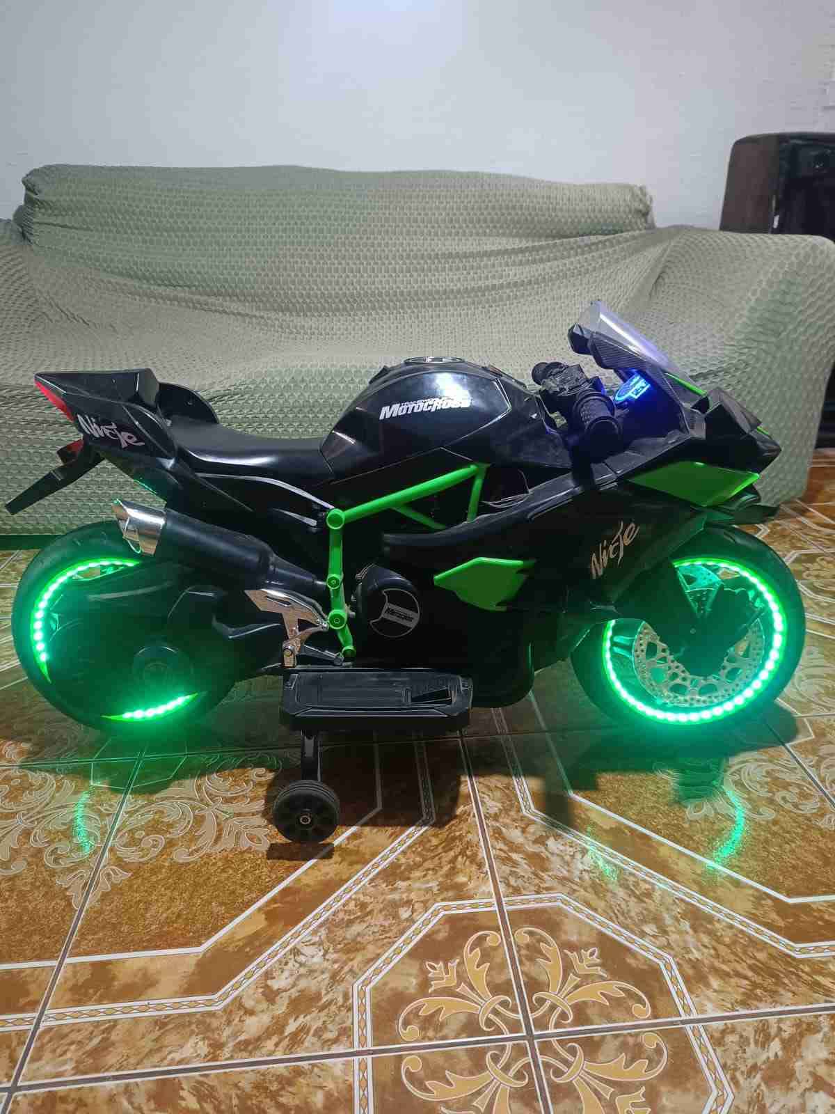 Moto eléctrica para niños con luces LED verdes. Ideal para aventuras en casa. En buen estado general.