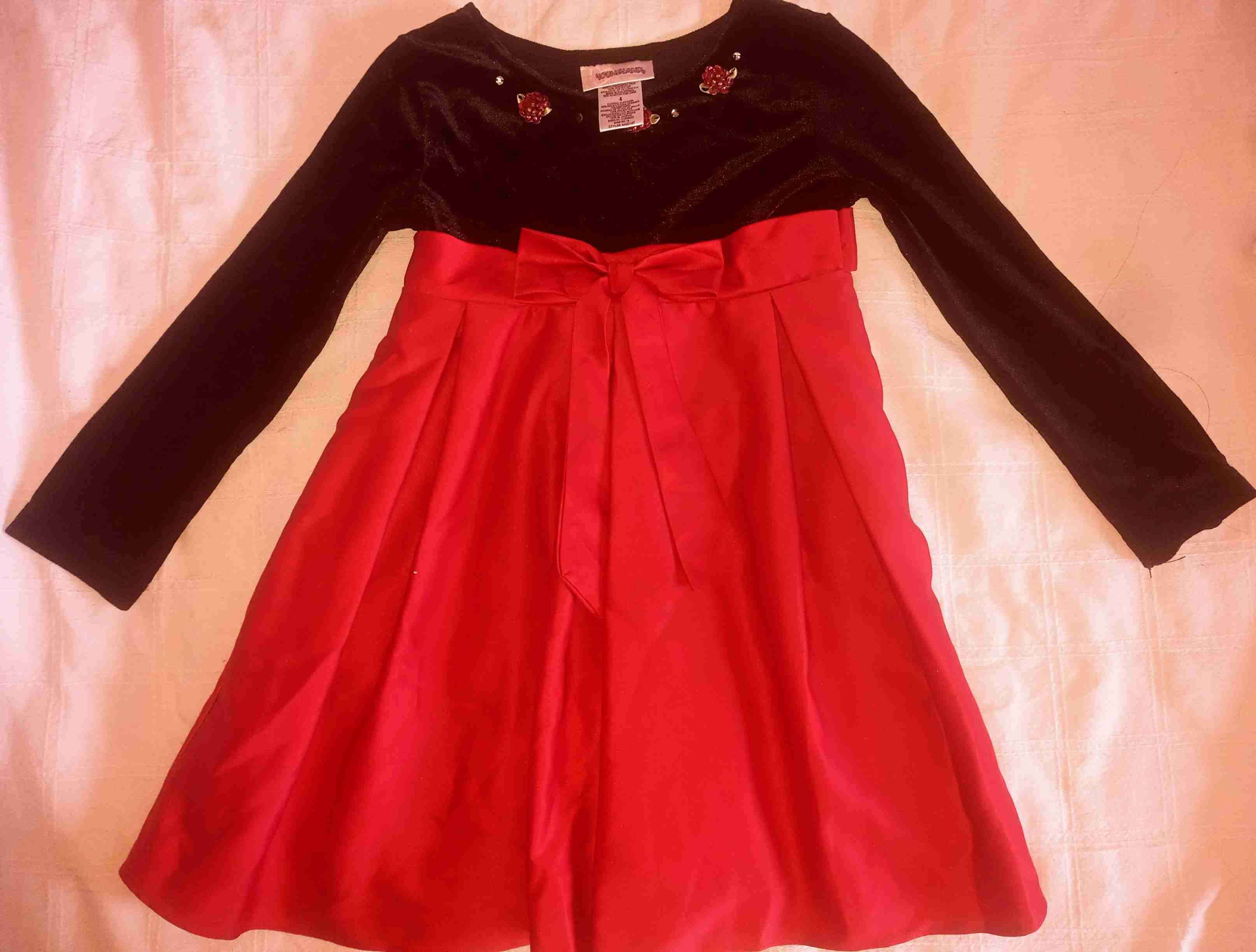 Elegante vestido para niña en negro y rojo, perfecto para eventos formales. Buen estado, con detalles de lazo y flores. Talla 4.