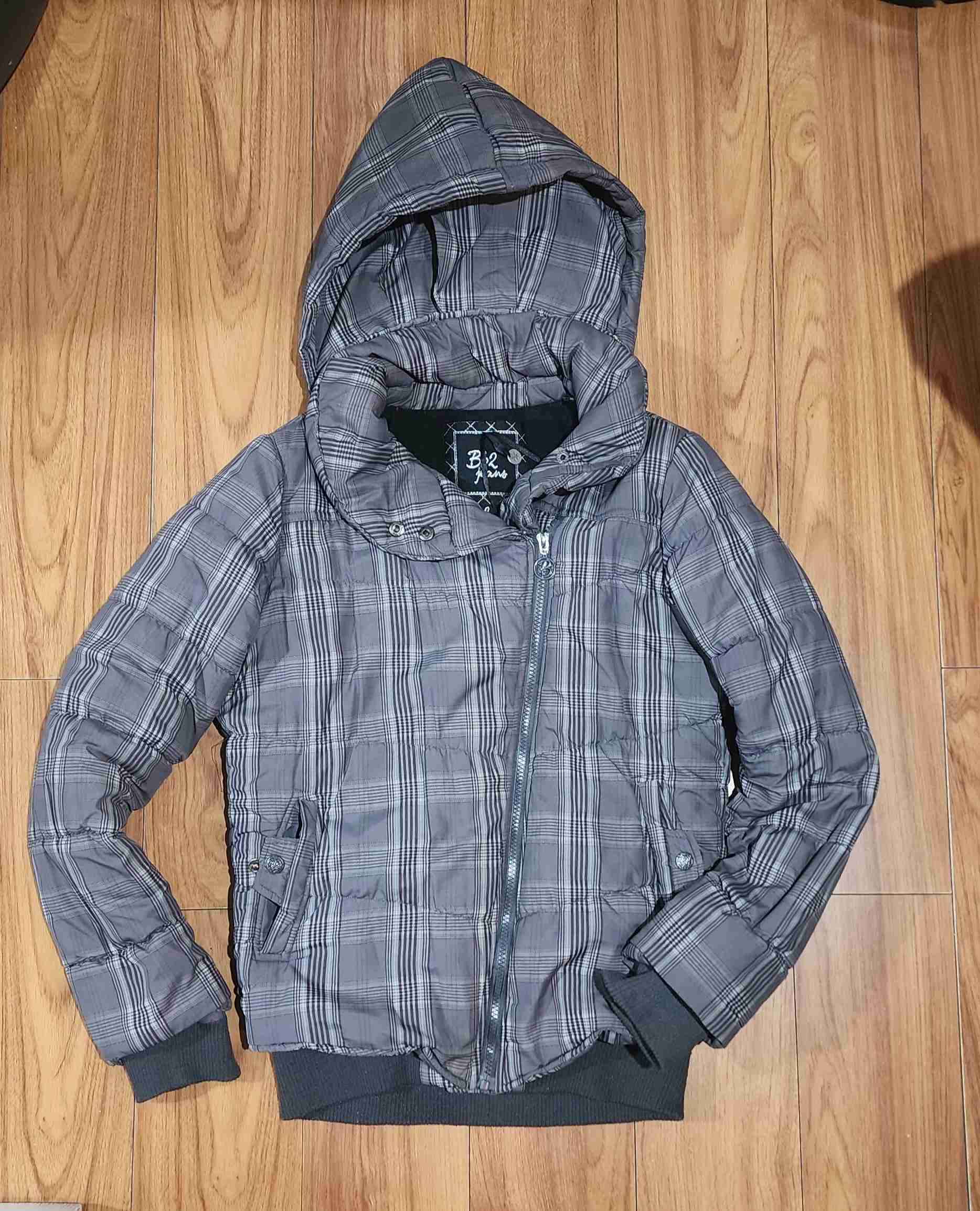 Chaqueta gris con patrón a cuadros y capucha, ideal para invierno. Buen estado, ligera y abrigadora. Barbados Talla S/M