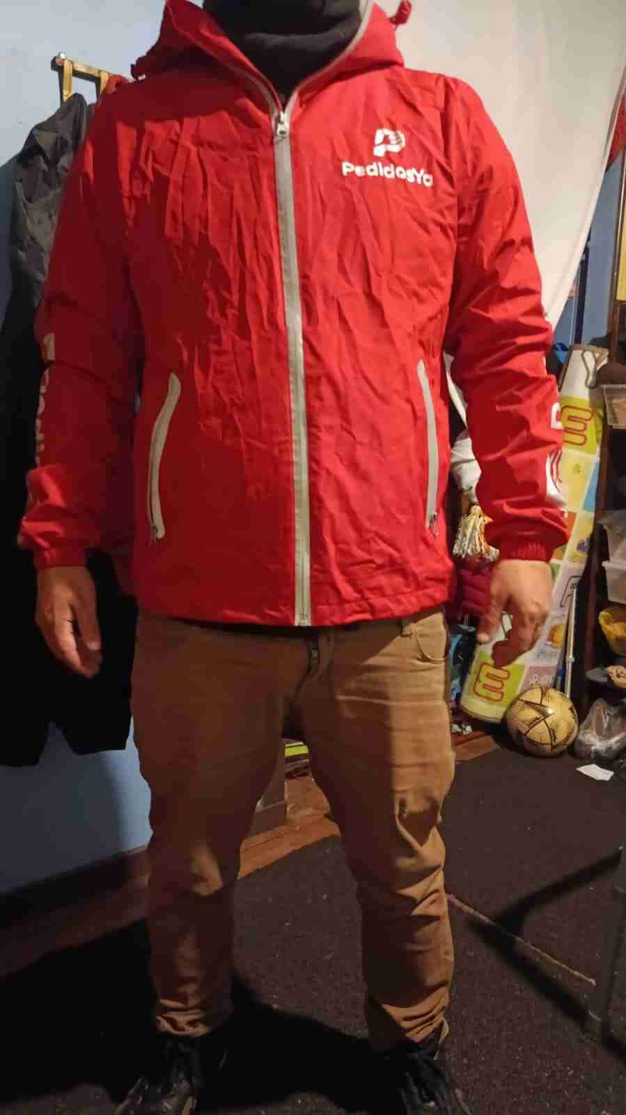 Chaqueta roja de PedidosYa, perfecta para días lluviosos. En buen estado, ideal para trabajar o uso casual.