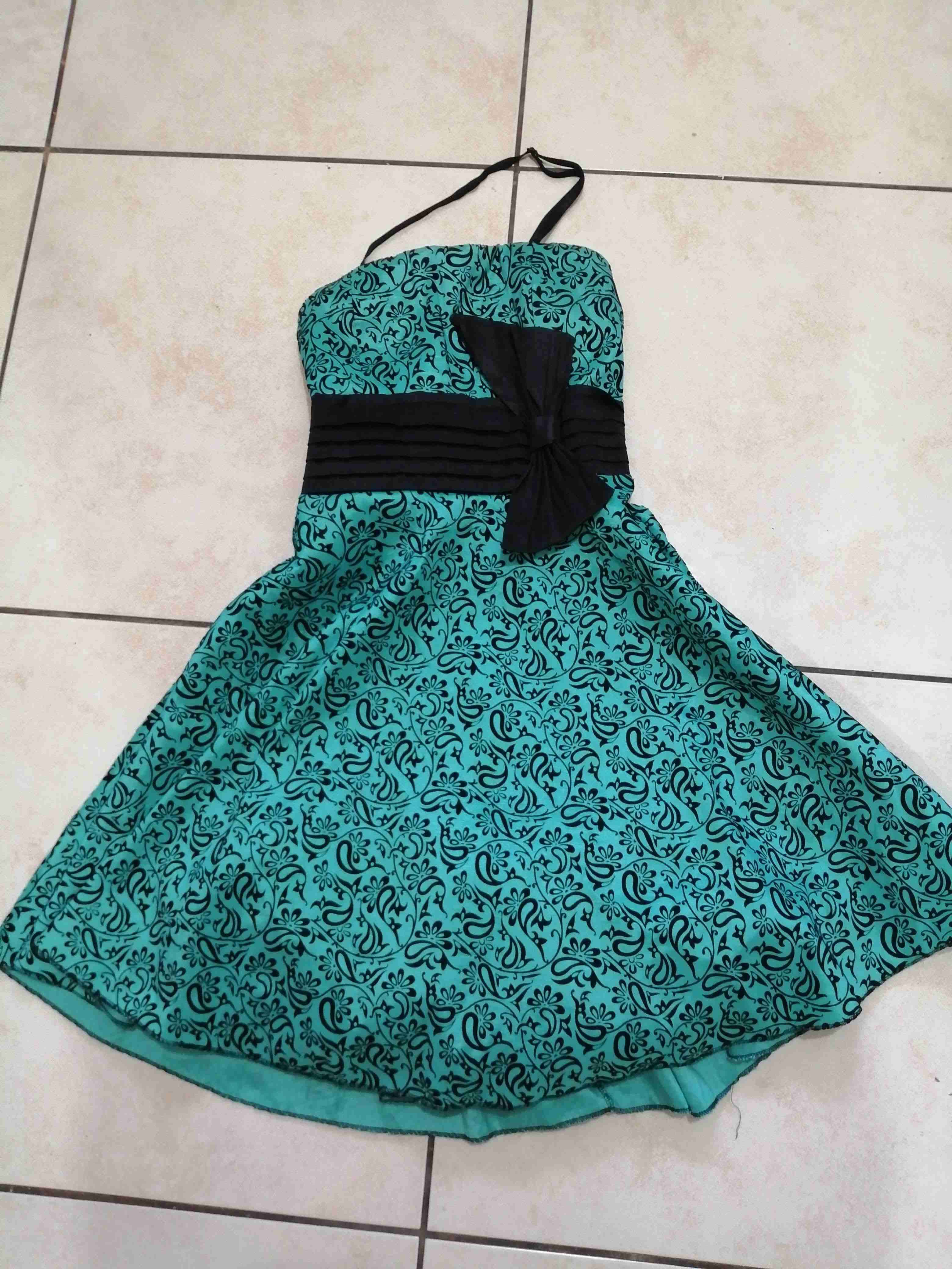 Vestido corto de tirantes en tono turquesa con diseño floral y lazo negro. Ideal para ocasiones especiales, en buen estado.
