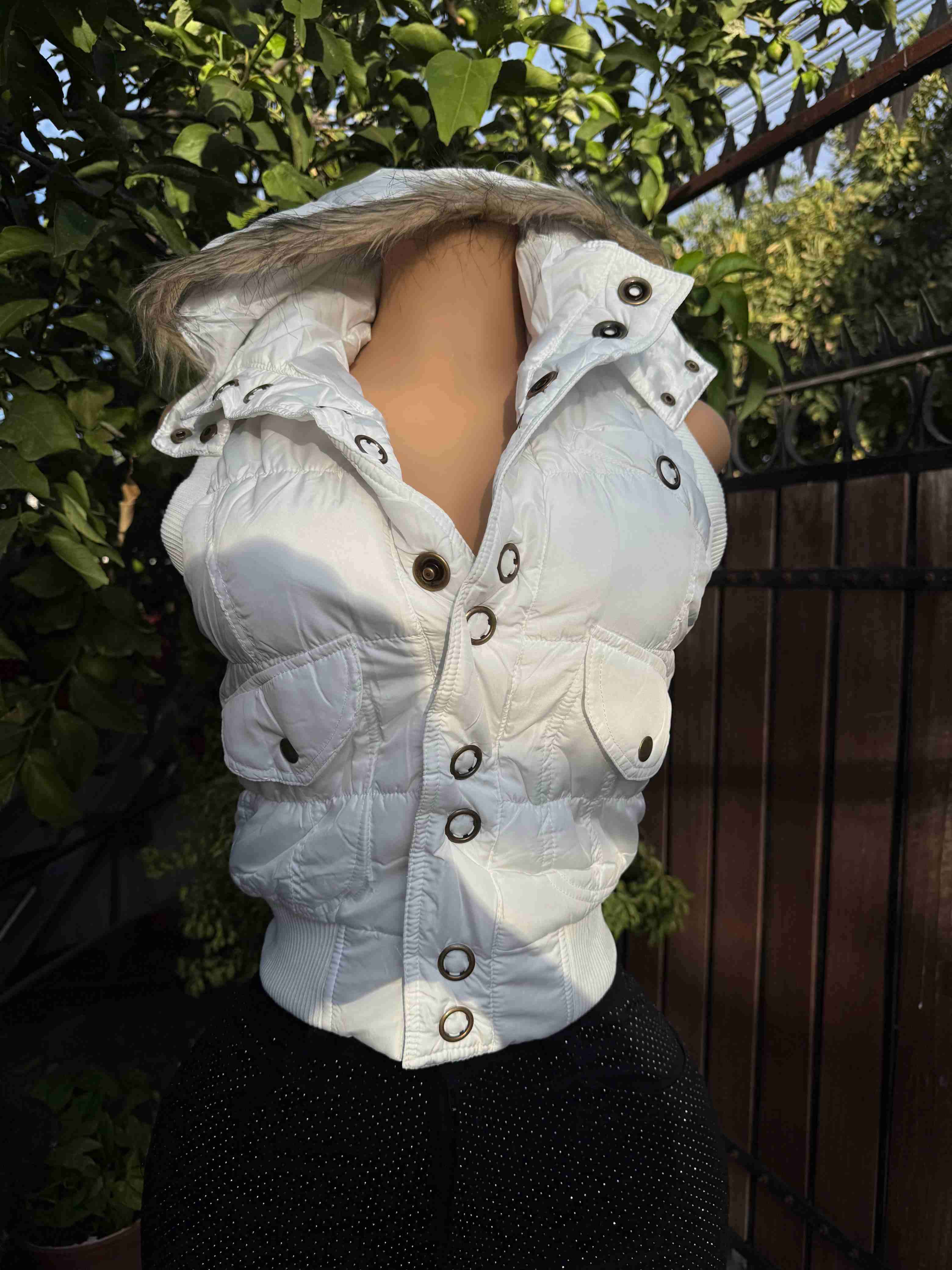 Chaleco acolchado blanco con capucha forrada de peluche. Ideal para días fríos.