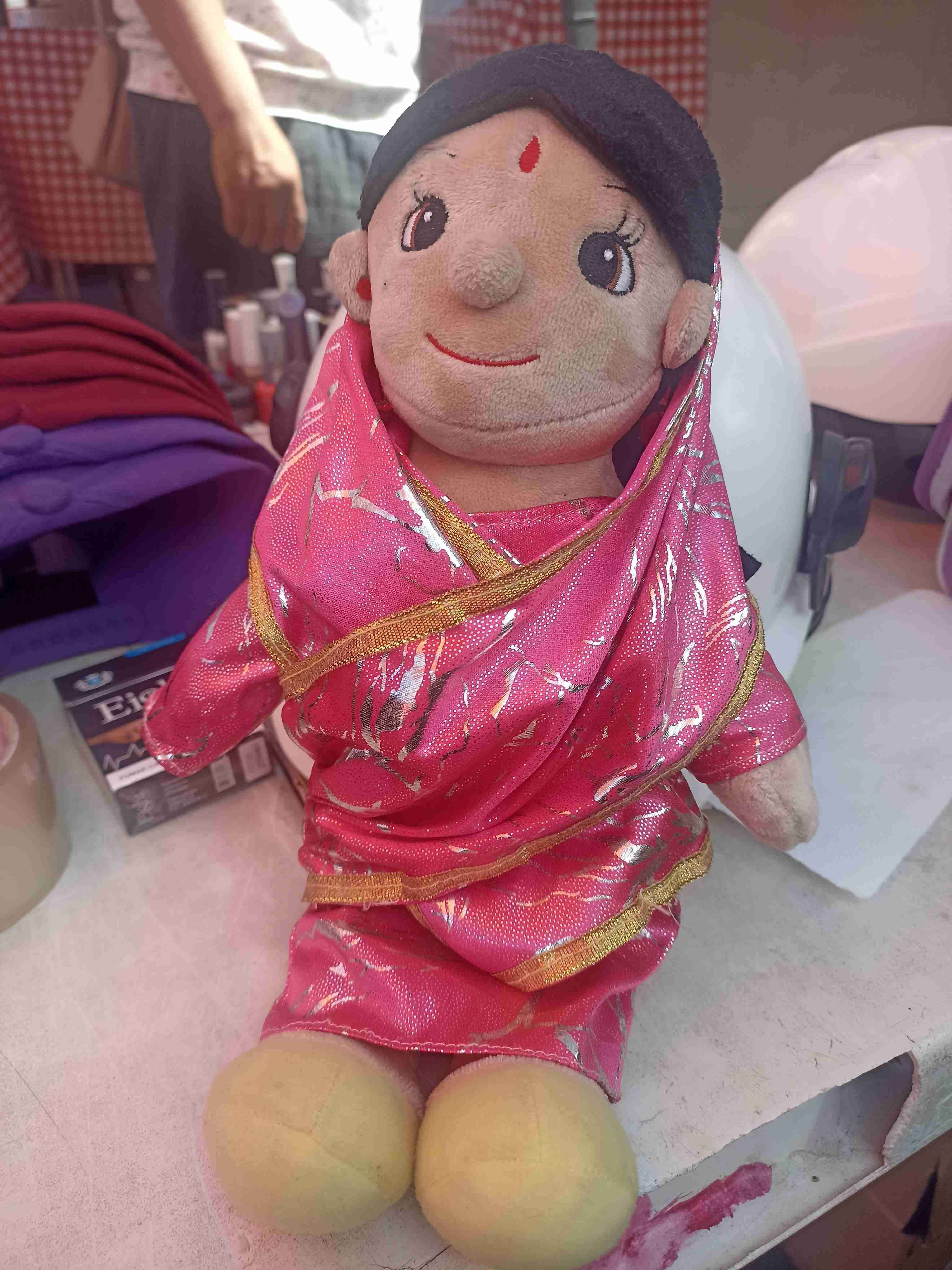 Muñeca de tela con vestido sari rosa, ideal para decoración o juego infantil. En buen estado.