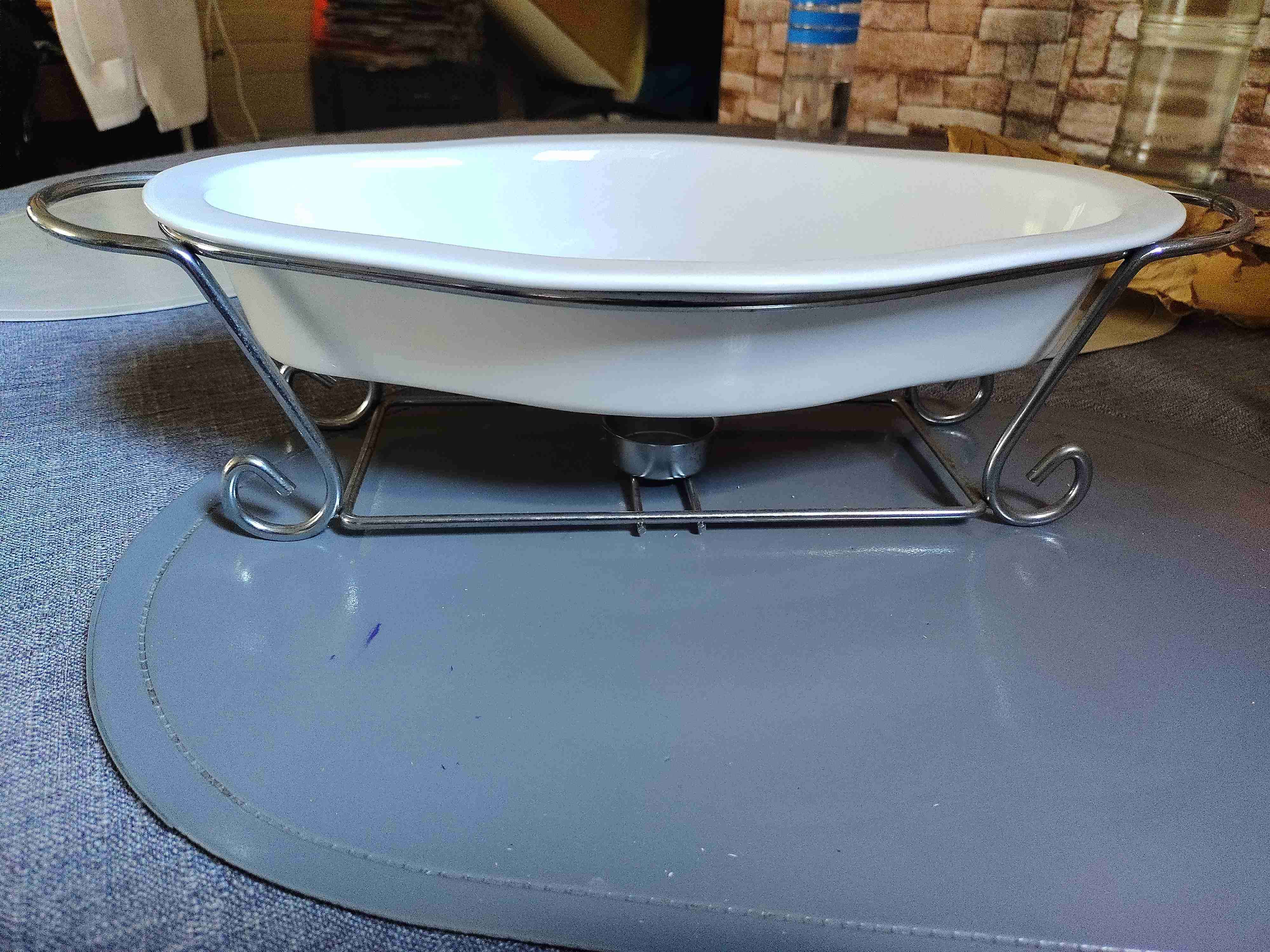 Pirex con soporte de metal, ideal para mantener comidas calientes.