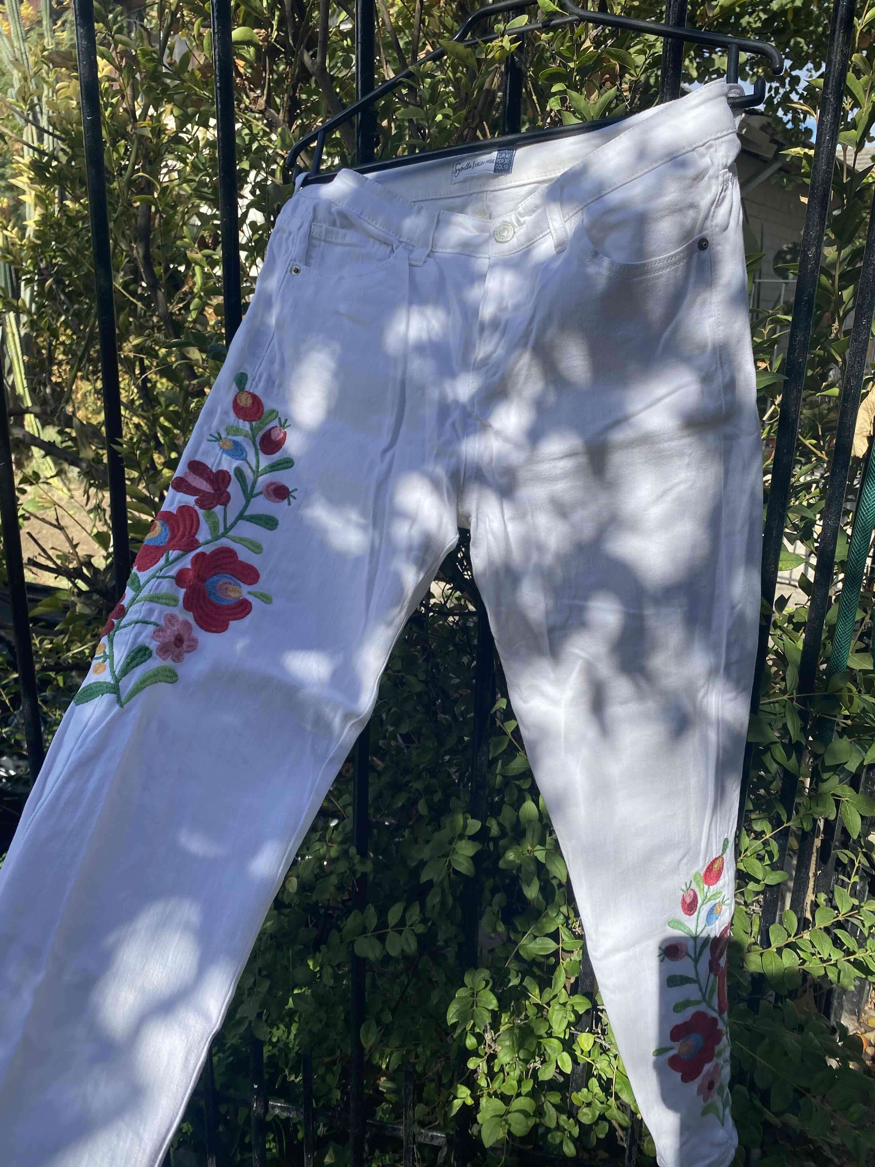 Pantalones blancos con bordado floral colorido. Perfectos para un look veraniego casual. En buen estado.