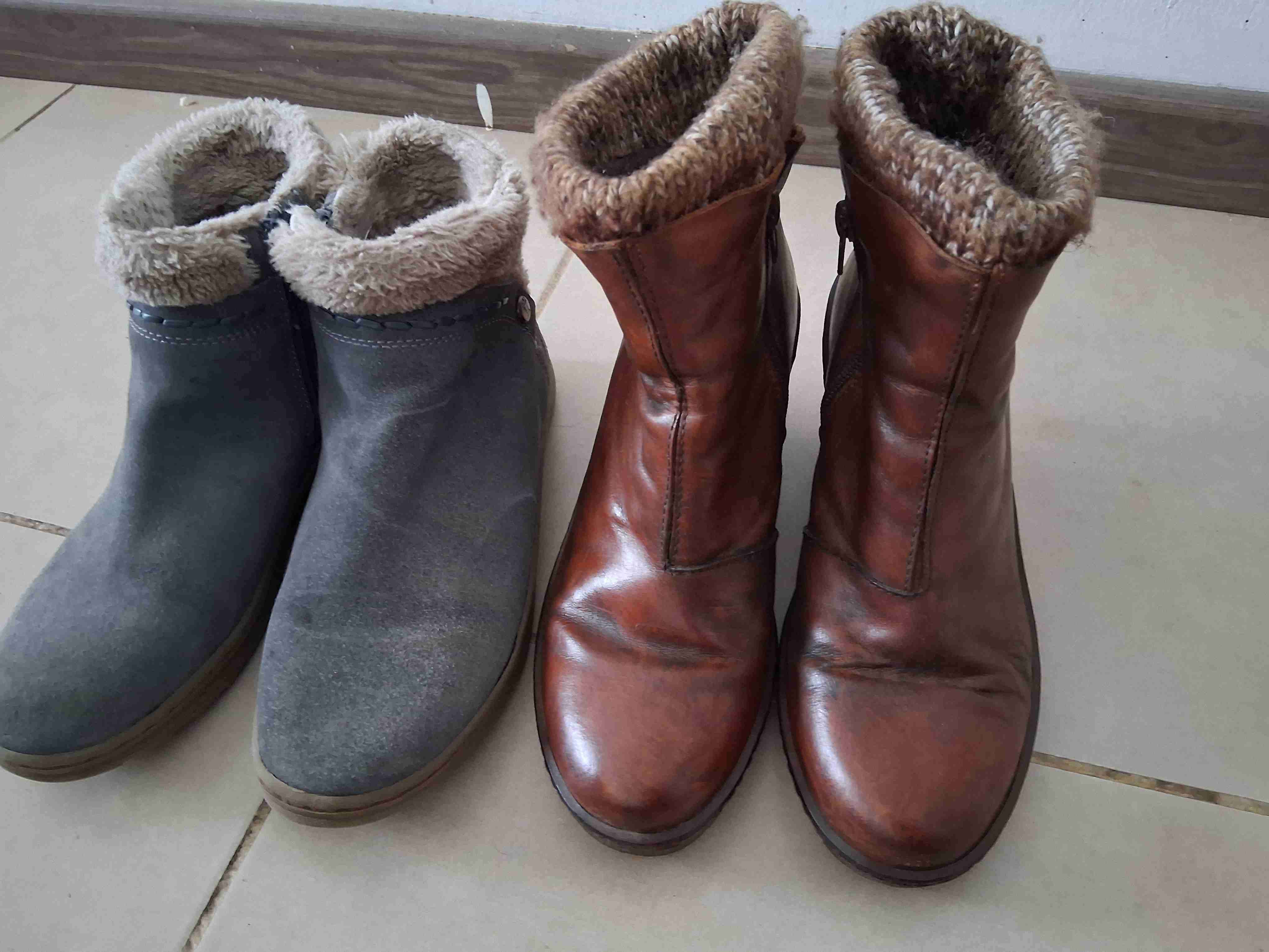 Dos pares de botines, uno de cuero marrón y otro de gamuza gris, en buen estado con forro interior cálido. Ideales para el invierno.
