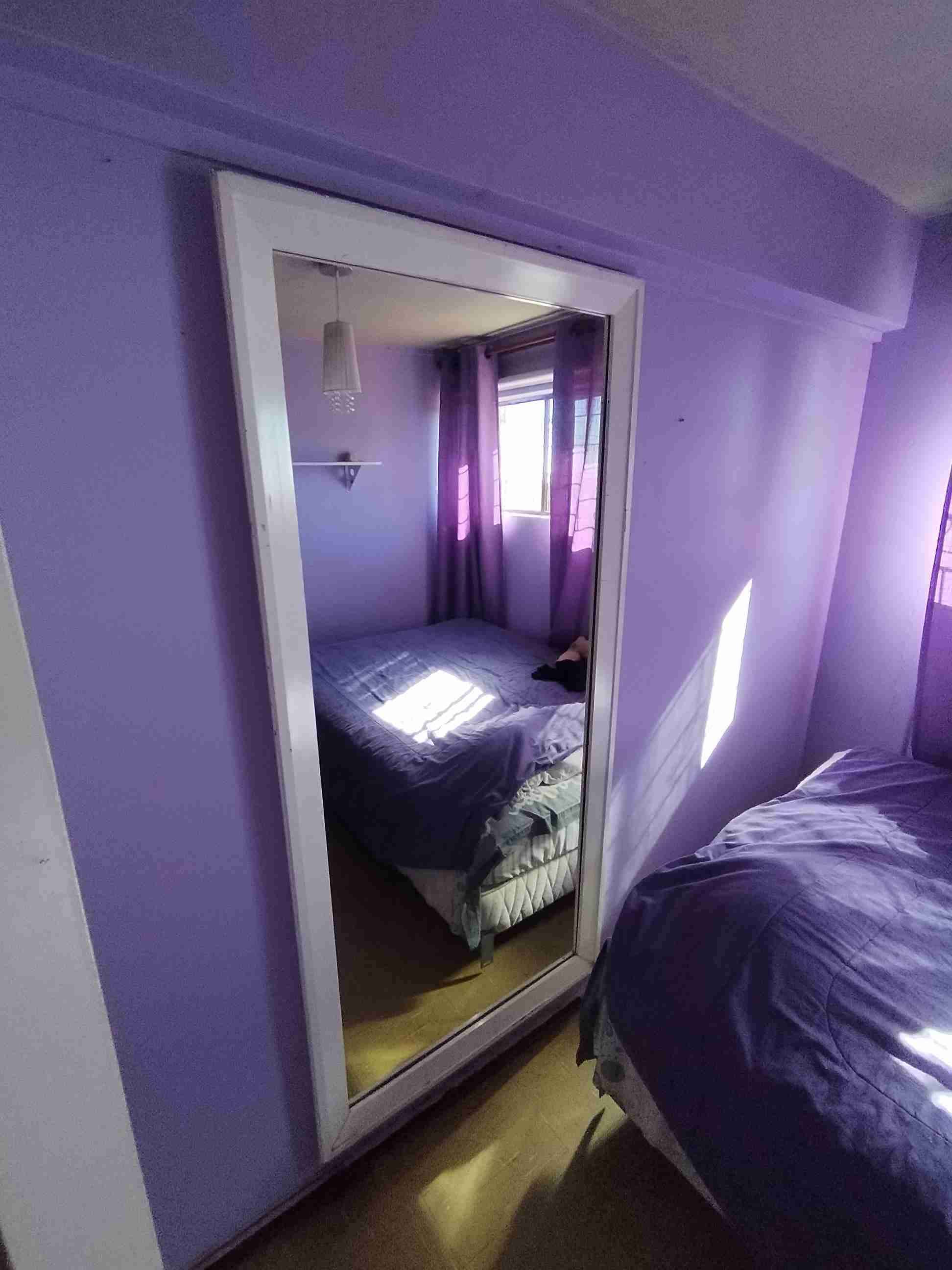 Espejo de pared grande, ideal para dormitorio. Estado general bueno, con marco blanco elegante.