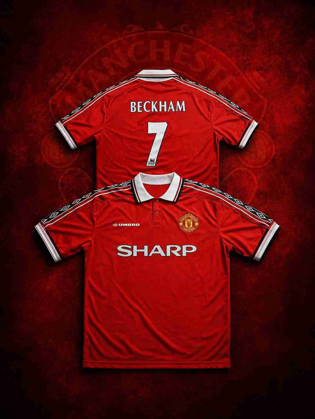 Camiseta retro del Manchester United con nombre Beckham. En buen estado para coleccionistas o fanáticos.