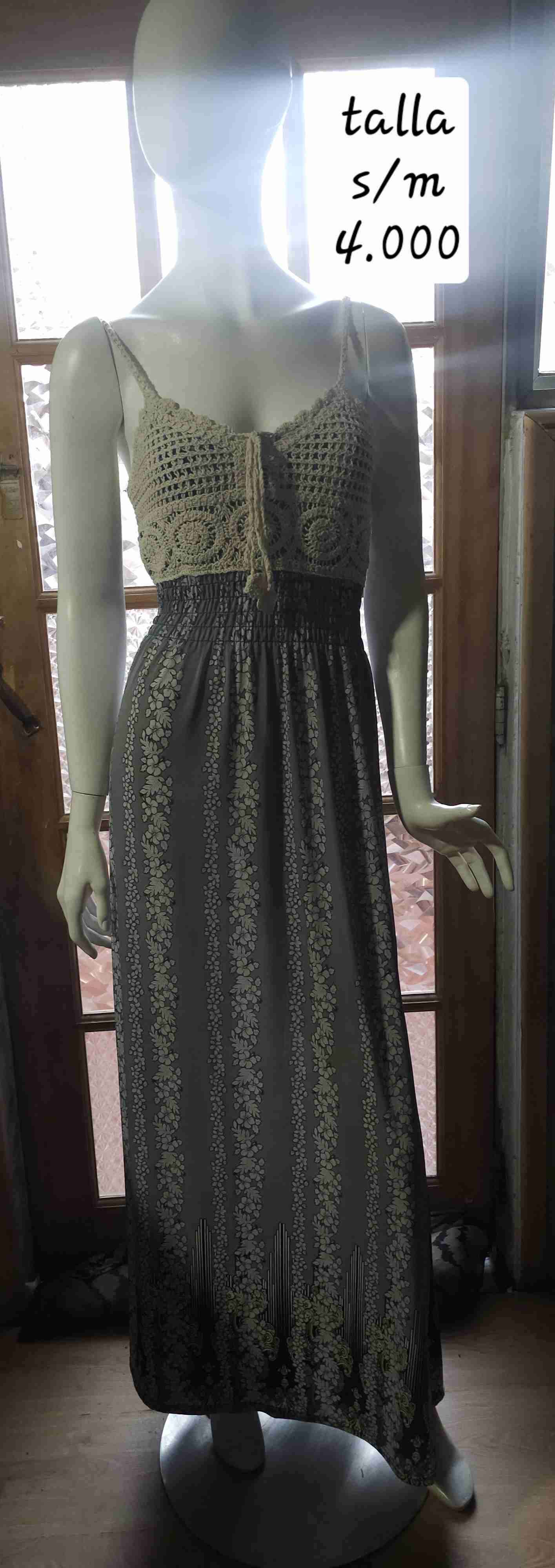 Vestido largo con busto de crochet y falda floral. Ideal para un look veraniego y relajado. En buen estado.