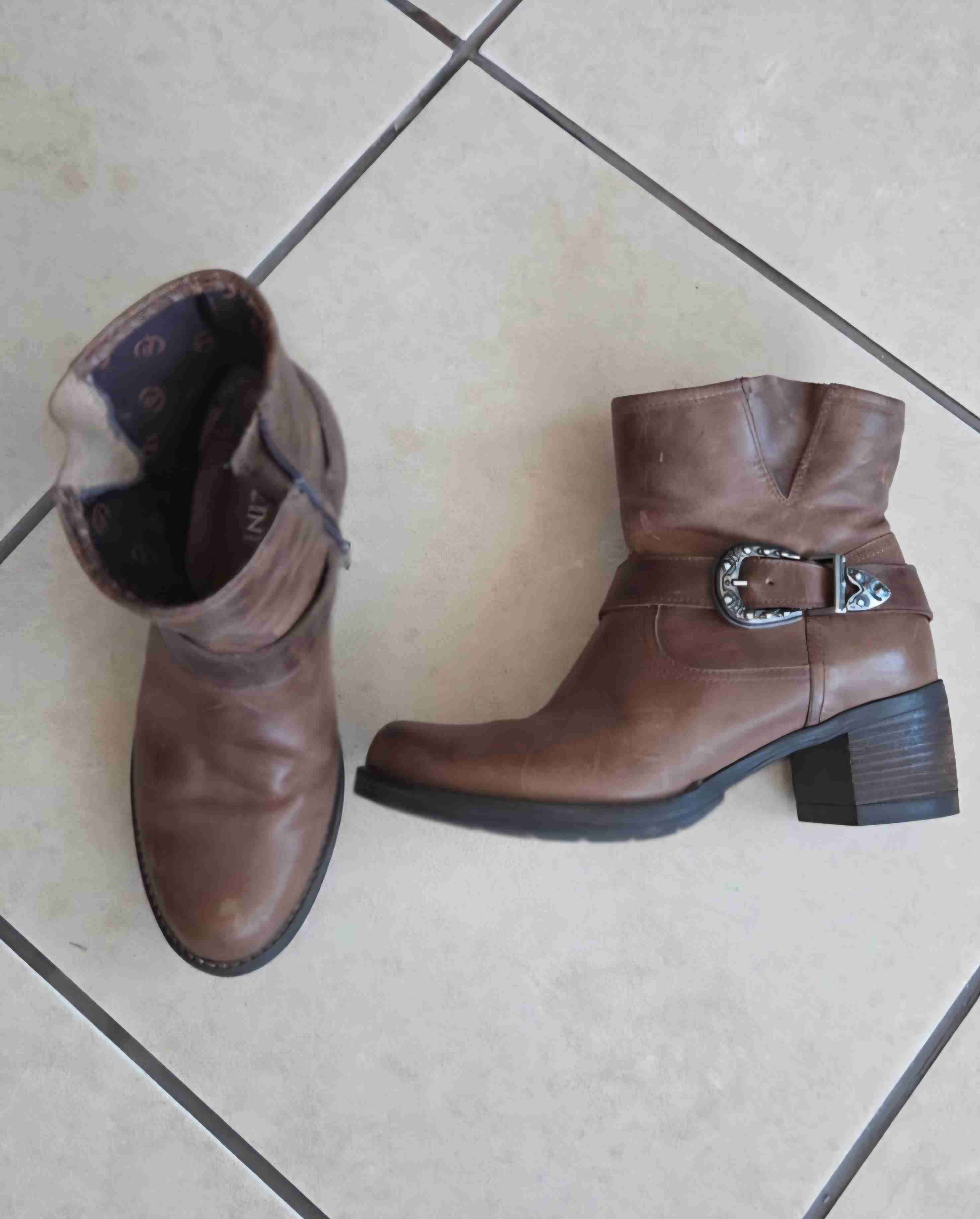 Botines marrones de cuero, estilo casual. Algunos signos de uso pero en buen estado. Ideal para el día a día.