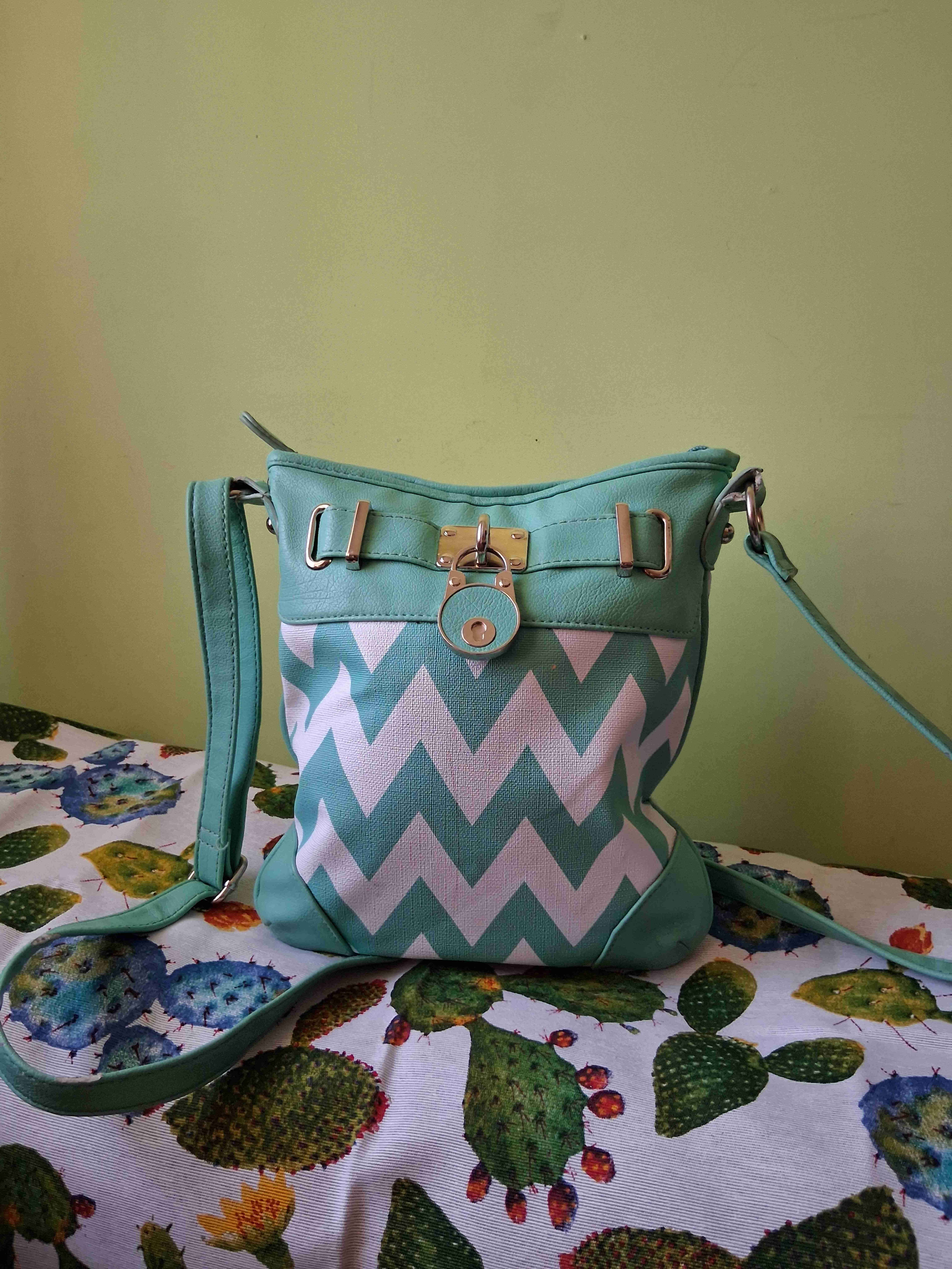 Cartera mediana color verde menta con diseño zigzag, ideal para el día a día. En buen estado.