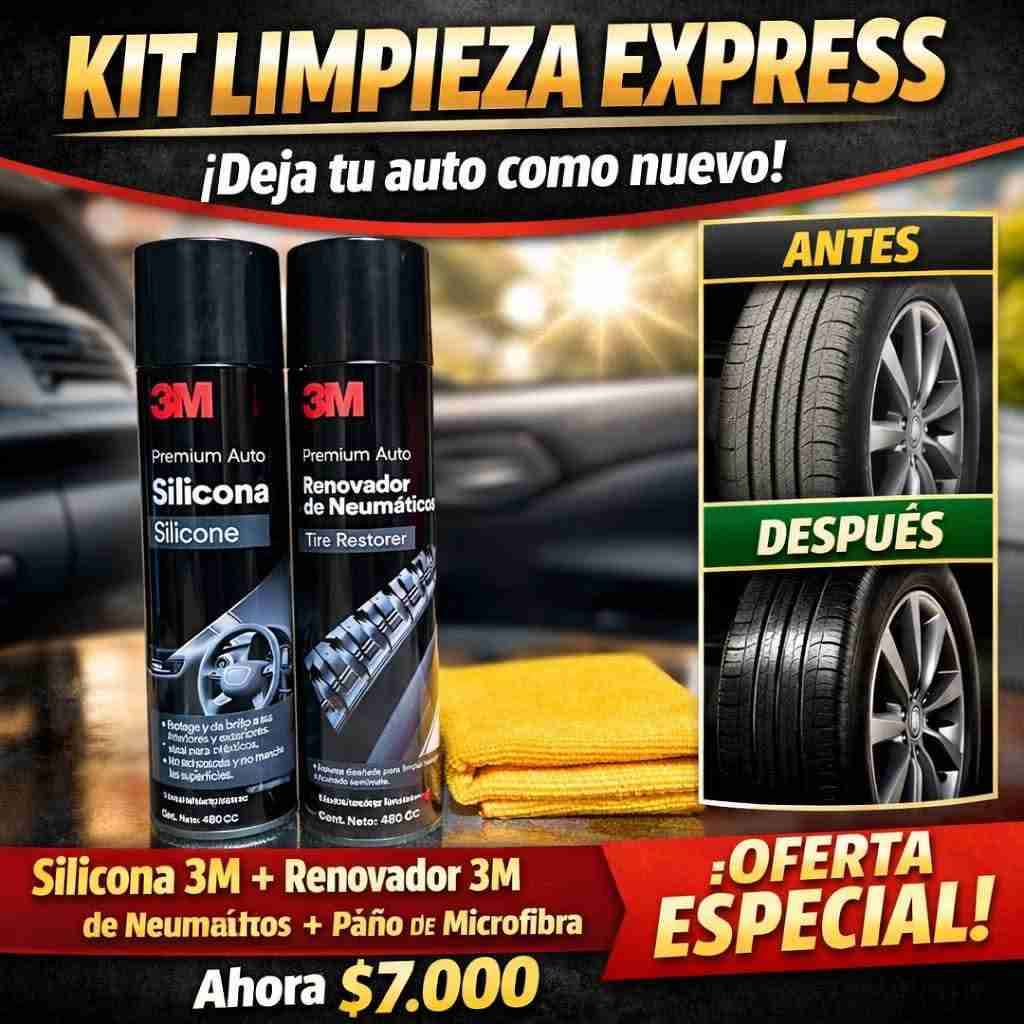 Kit de limpieza automotriz 3M con silicona y renovador de neumáticos más paño de microfibra. Deja tu auto como nuevo.