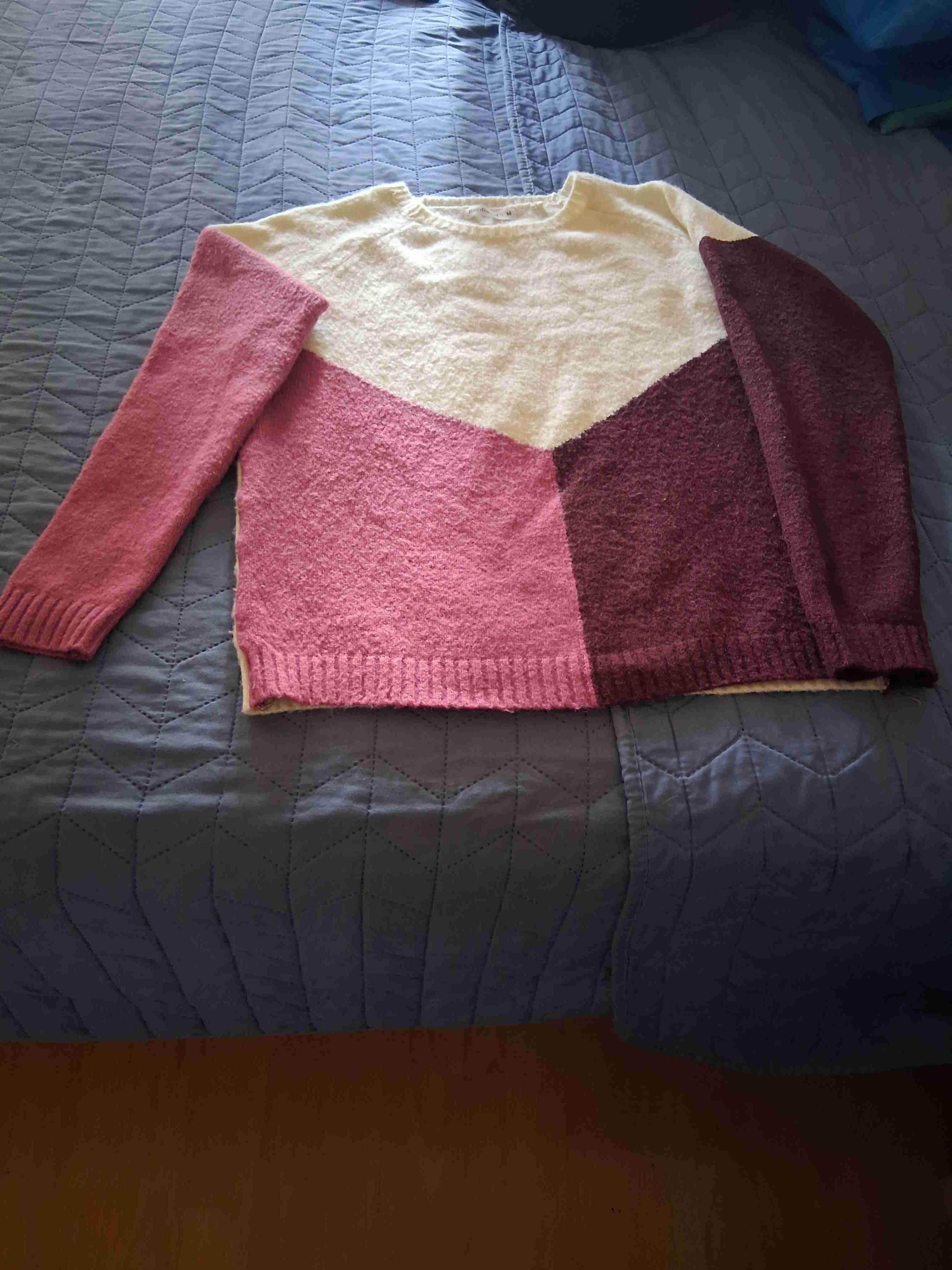 Sweater de lana con diseño tricolor en tonos rosado, crema y burdeos. En buen estado, ideal para el invierno.
